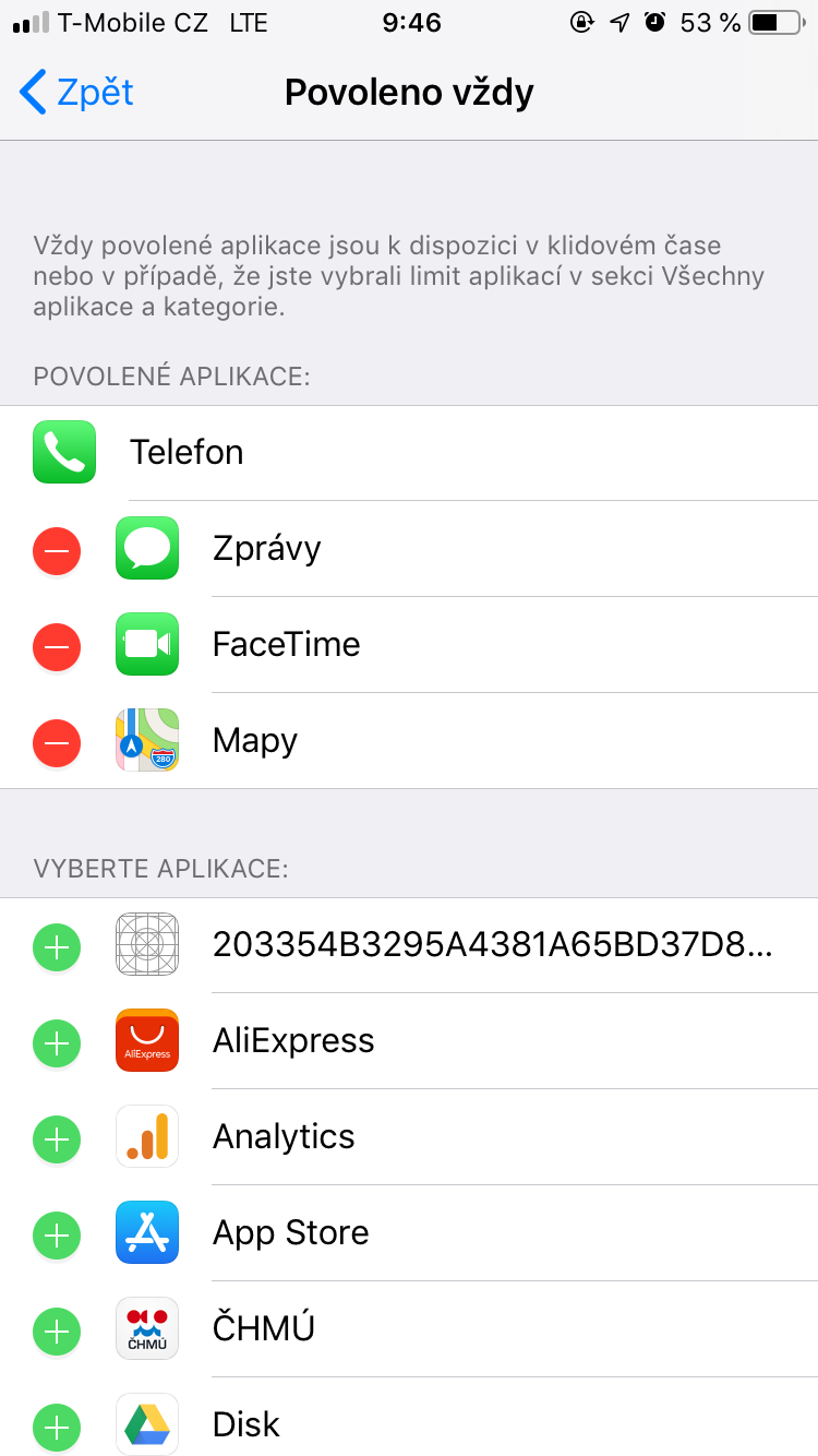 V této sekci si můžete zvolit aplikace, které budou povolené jak v případě aktivní funkce Klidový čas, tak v případě aktivních Limitů pro aplikace. Jednoduše to znamená, že i v době klidu či po vypršení limitu pro aplikaci budete moct právě tyto aplikace používat i nadále. To se hodí především pro volání – tzn. Telefon a nebo například pro Mapy.