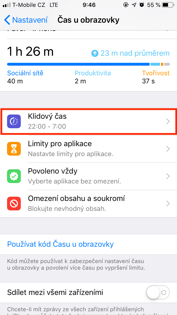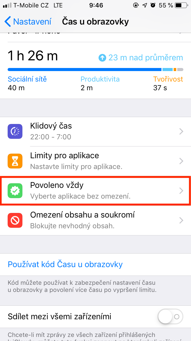 Čas u obrazovky si samozřejmě také můžete zamknout pomocí kódového zámku – stačí jednoduše zvolit možnost Používat kód Času u obrazovky – to je především pro případ, že se za sebe stydíte (vtip). Chcete-li si zobrazit zprávy z funkce Čas u obrazovky ze všech účtů přihlášených k iCloudu, můžete aktivovat funkci Sdílet mezi všemi zařízeními. A pokud máte ze všech těch čísel panickou hrůzu, pomocí poslední možnost Vypnout Čas u obrazovky můžete celou tuto funkci deaktivovat.