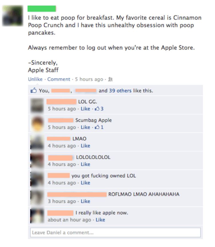 Že jsou Apple Story pouze nudnými obchody? Omyl! Našli jsme pro vás 19 důkazů o tom, že i zde lze narazit na situace, která vás zaručeně rozesmějí. A samozřejmě si můžete odnést po prohlédnutí galerie i ponaučení – nikdy se nezapomeňte odhlásit z Facebooku či jiné sociální sítě, pokud vás napadne se do ní v obchodě přihlásit. Může vás totiž čekat nemilé překvapení.