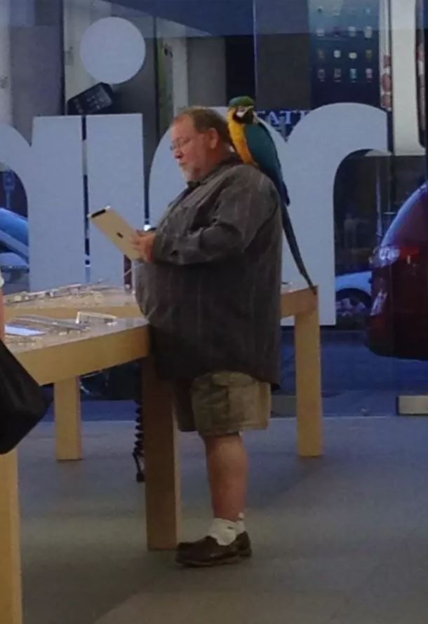 Ta fotka s papouškem je normální. Prostě pán má papouška stejně jako někdo psa.