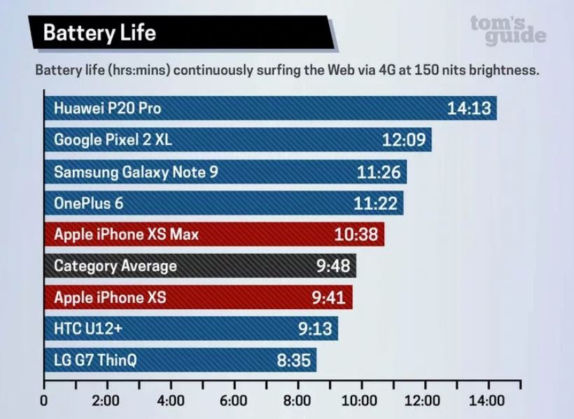 Apple na Keynote tvrdil, že iPhone XS vydrží o 30 minut déle oproti iPhonu X, XS Max dokonce o 90 minut déle. Pravda je však někde jinde. Při testu byl na obou modelech nastaven jas na úroveň 150 nitů s vypnutím automatického jasu i True Tone. Telefony během testu procházely webové stránky. iPhone XS vydržel při tomto nastavení 9 hodin a 41 minut, XS Max 10 hodin a 38 minut. Větší model tedy výrazně převyšuje průměr v této kategorii, který je 9 hodin a 48 minut, avšak i tak zaostává za iPhonem X. Ten vloni při stejném testu vydržel 10 hodin a 49 minut!