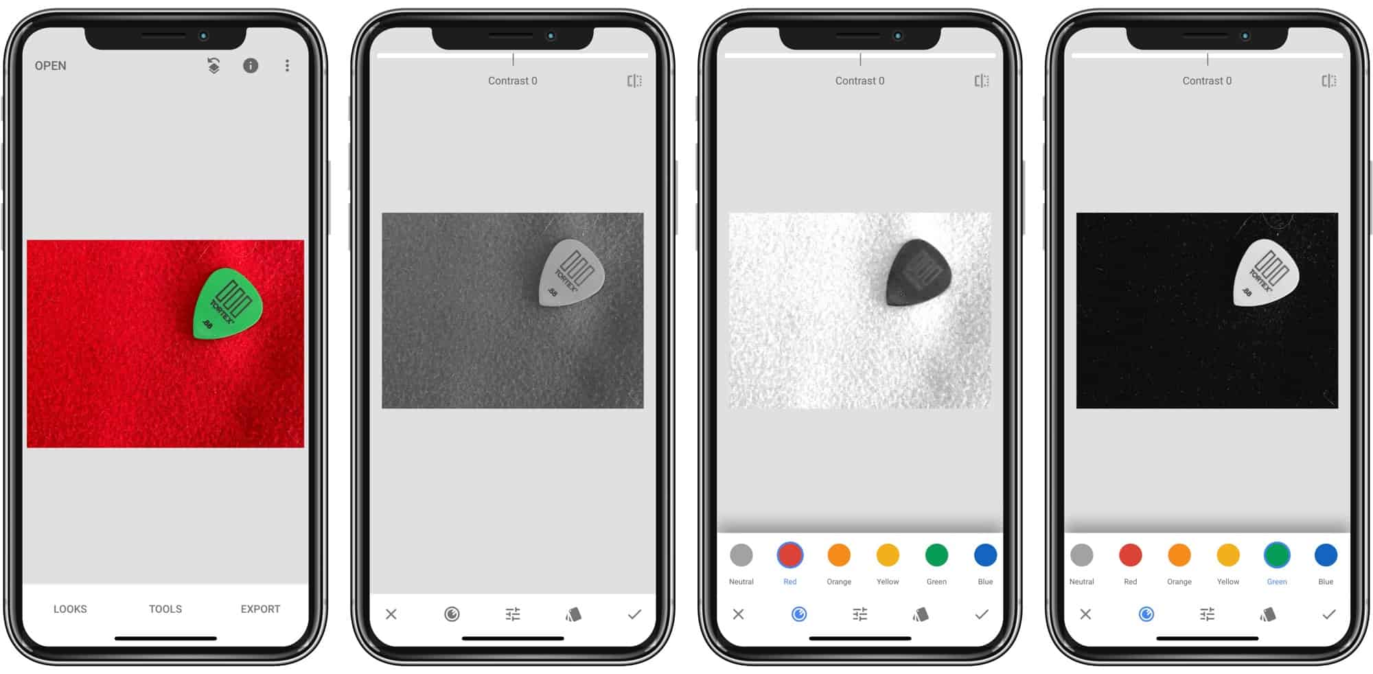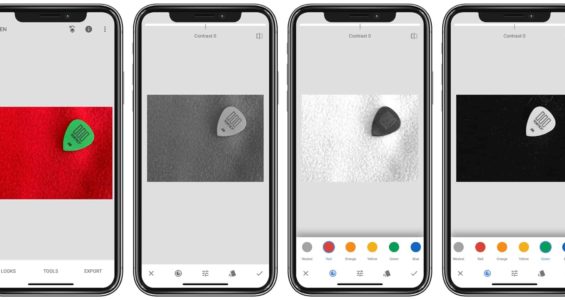 Černobílé snímky můžete vylepšit i barevnými filtry. V tuto chvíli ale nemluvíme o softwarových filtrech, nýbrž o těch, kterými můžete překrýt čočku fotoaparátu. Na snímku z webu Cult of Mac můžete vidět použití fyzických filtrů na příkladu snímku zeleného objektu na červeném pozadí. V obyčejném černobílém pojetí nevypadá takové zátiší příliš dobře, použití červeného filtru přes čočku fotoaparátu iPhonu ale dokáže ledacos změnit – zesvětlí červenou a ztmaví zelenou. Zelený filtr si s fotografií poradí s opačným výsledkem. Oranžový filtr zase dokáže na černobílé fotografii potlačit červené nedokonalosti pleti. Pořízení barevných filtrů pro překrytí fotoaparátu vás navíc nevyjde příliš draze. Stačí pouze zapátrat například na čínských eshopech.
