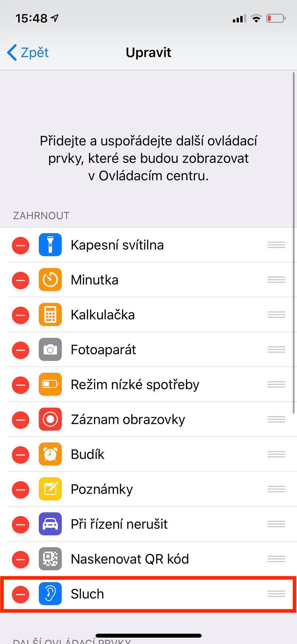 V případě, že vlastníte AirPody, je postup trošku jiný. Nejdříve je nutné, abyste si do ovládacího centra přidali možnost Sluch. To provedeme jednoduše tak, že přejdeme do Nastavení -> Ovládací centrum -> Upravit ovládací prvky. Zde poté sjedeme níže a pomocí pluska přidáme možnost Sluch do ovládacího centra. Pokud chcete funkci Živý poslech aktivovat s AirPody, tak stačí, abyste si pomocí gesta otevřeli ovládací centrum, tapnuli na ikonu ucha a zde si funkci aktivovali či deaktivovali. Tuto zkratku lze samozřejmě využít i pro jiná naslouchátka s certifikací MFi, nikoliv pouze pro AirPody.