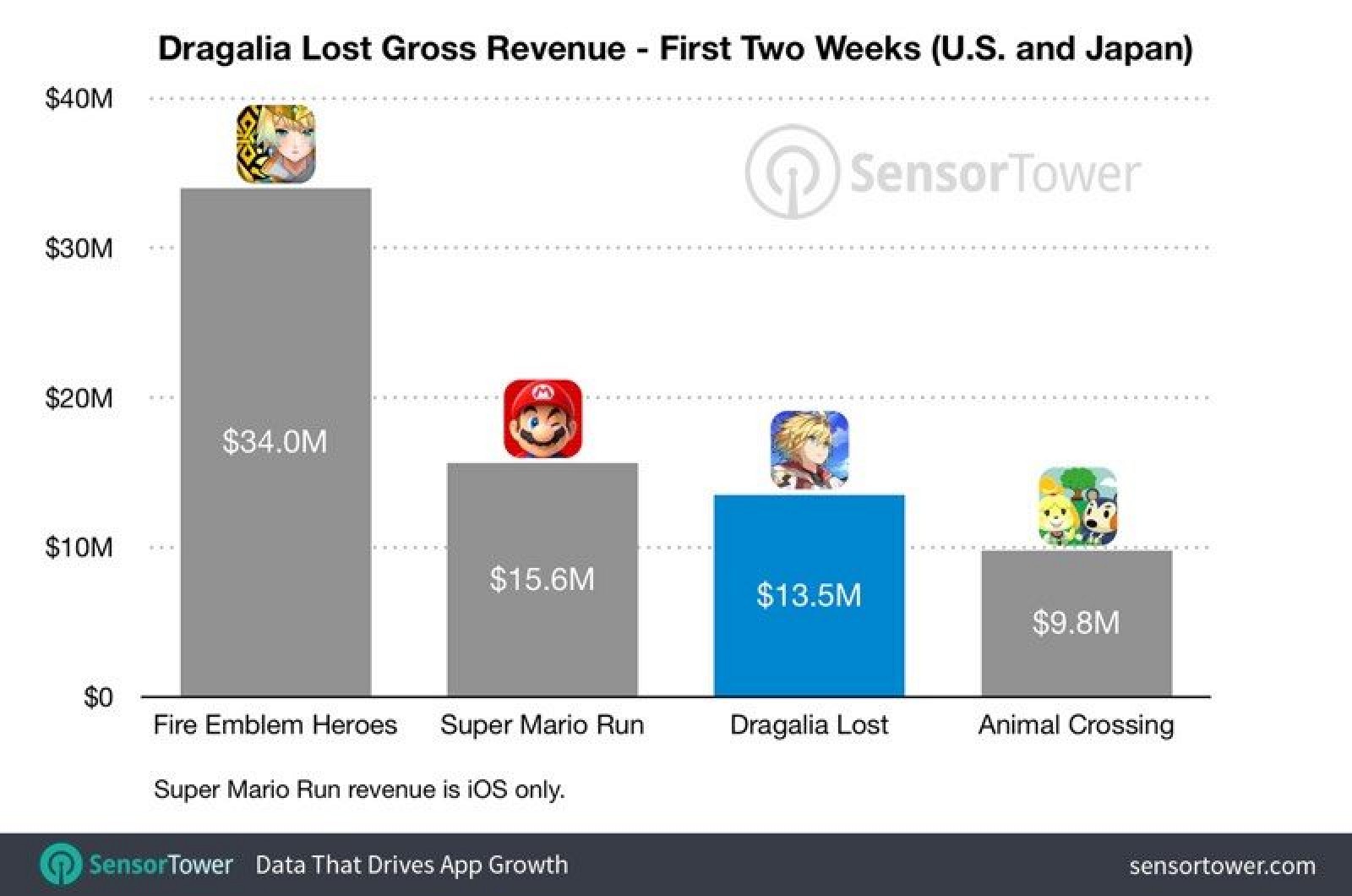 Príchod známeho titulu Dragalia Lost, ktorý sa dočkal nového mobilného spracovania na iOS predstavoval jednu z najočakávanejších udalostí posledných týždňov. Počin z produkcie spoločnosti Nintendo sa za dva týždne vytiahol v rebríčku popularity natoľko, že svojim tvorcom vynáša väčšie rozprávkové zisky, ako nejeden známy titul podporovaný pre iOS. Podľa analytikov z firmy Sensor Tower sa hre podarilo zarobiť až 16 miliónov počas uplynulých 14 dní a to len v súvislosti s digitálnymi obchodmi App Store a Google Play. Jedná sa o tretiu najziskovejšiu hru, ktorú Nintendo spustilo pre platformu mobilných zariadení s iOS alebo Android.