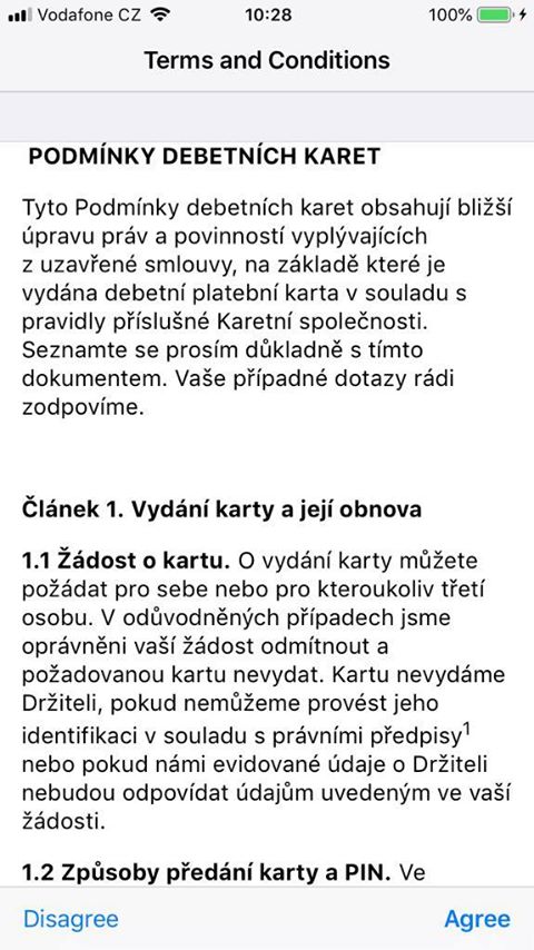 Lukáš má dle svých slov na svém iPhonu nastavený region na Velkou Británii, ve které Apple Pay samozřejmě funguje. Když se však dnes pokusil do Wallet načíst českou kartu, dostal se až k jejímu ověření a smluvním podmínkám psaným v češtině, z čehož jasně vyplývá, že je Apple Pay skutečně velmi blízko. To poté potvrdila i Komerční banka na svém Twitteru, kde krom vysvětlení, že “proklikání se” až ke smluvním podmínkám zapříčinila chyba, uvedla, že se celá Česká republika chystá na příchod Apple Pay. I v jejím tweetu však opět zaznělo, že spuštění je v rukou Applu. Na druhou stranu, kdyby KB alespoň částečně netušila, jak blízko či daleko spuštění Apple Pay je, nejspíše by s implementací smluvních podmínek v češtině do služby příliš nepospíchala.