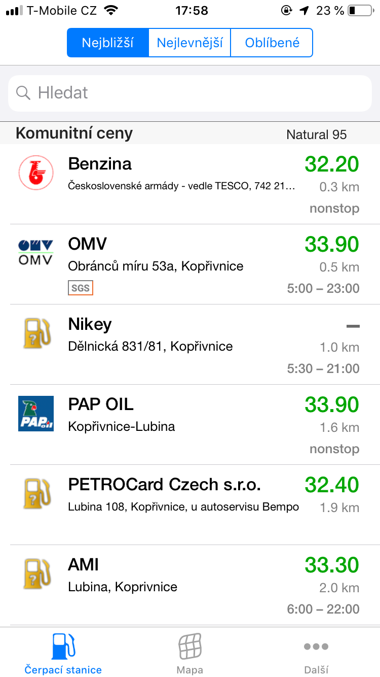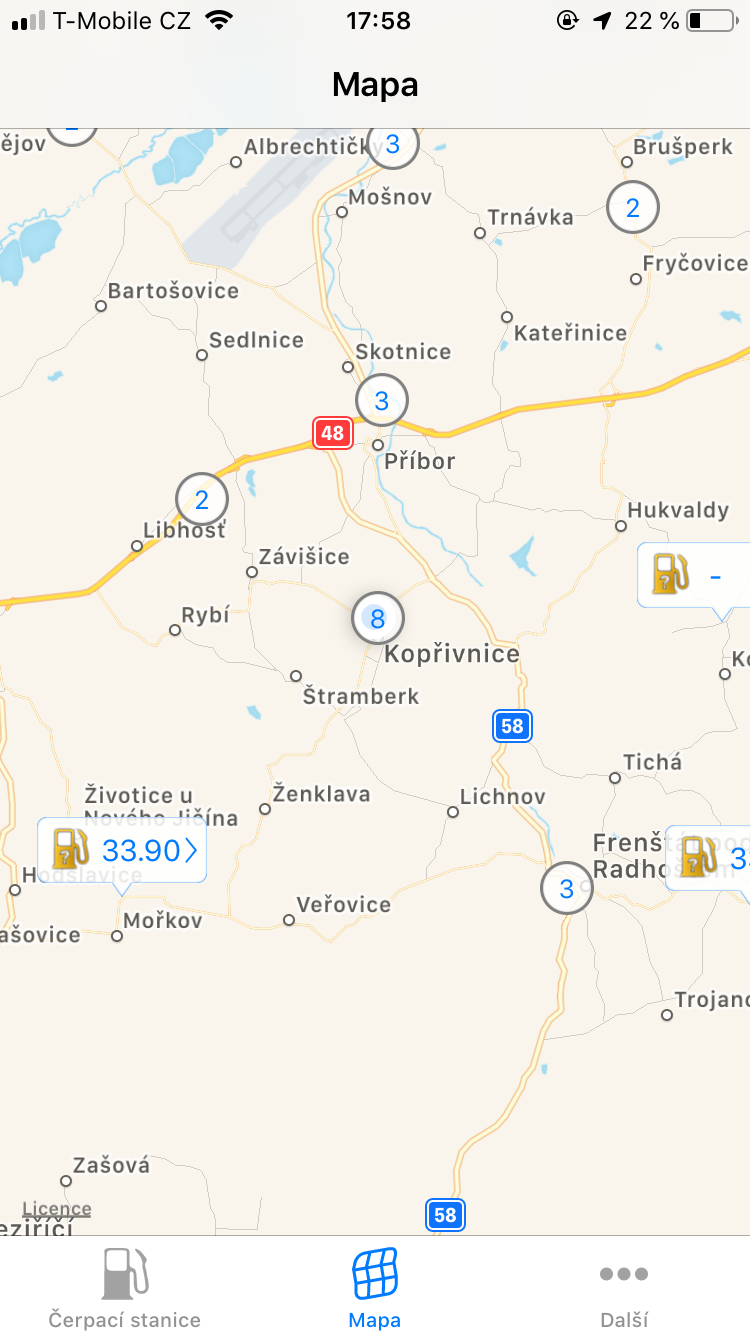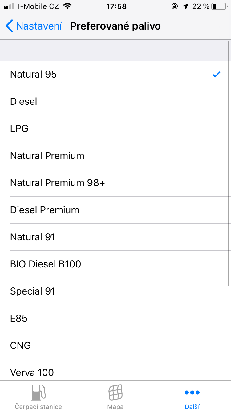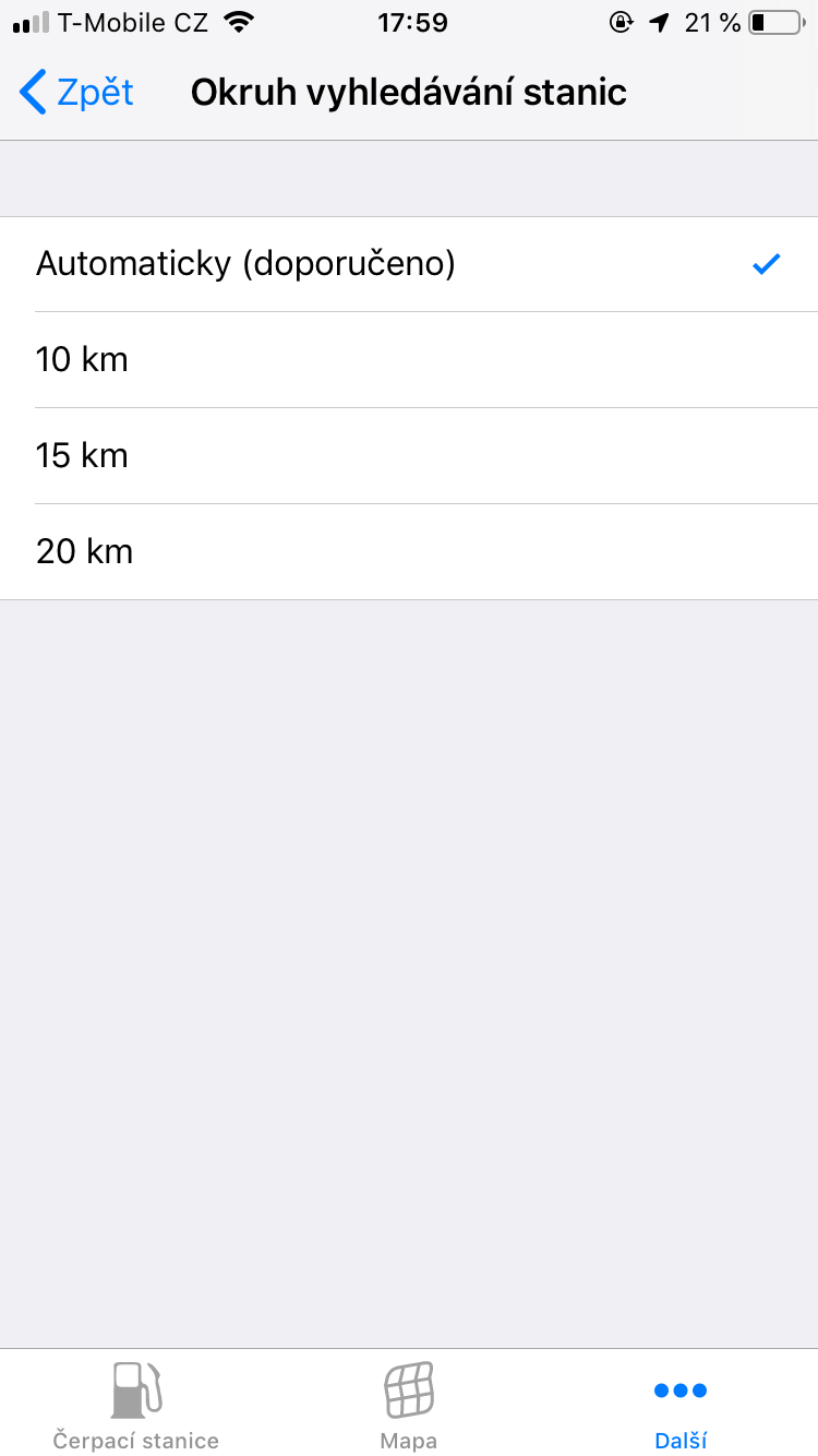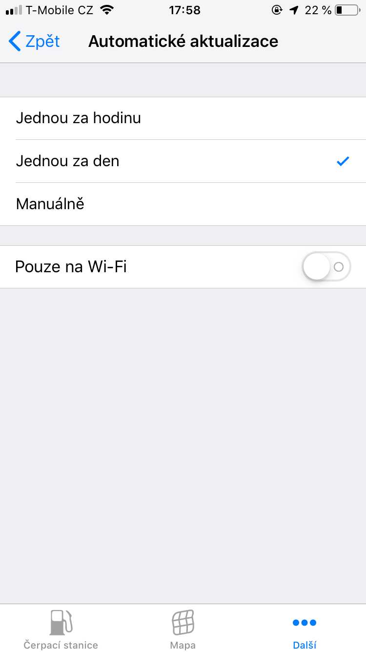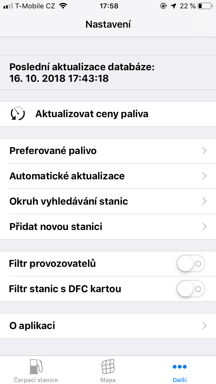 Ve spodním menu se dále nachází užitečná záložka Mapa. Mapa vám již dle svého názvu zobrazí mapu, na které se můžete jednoduše pohybovat tak, abyste našli právě vaši oblíbenou čerpací stanici. Tato funkce se může hodit například tehdy, pokud plánujete výlet někam dále (v rámci ČR) a nejste si jisti, kde se nachází jaká čerpací stanice. Poslední záložka Další je svým způsobem jakési nastavení aplikace. Můžete si zde ručně aktualizovat ceny paliv, dále si můžete nastavit preferované palivo, automatické aktualizace, okruh vyhledávání stanic či můžete přidat novou čerpací stanici, která ještě není součástí momentální databáze.