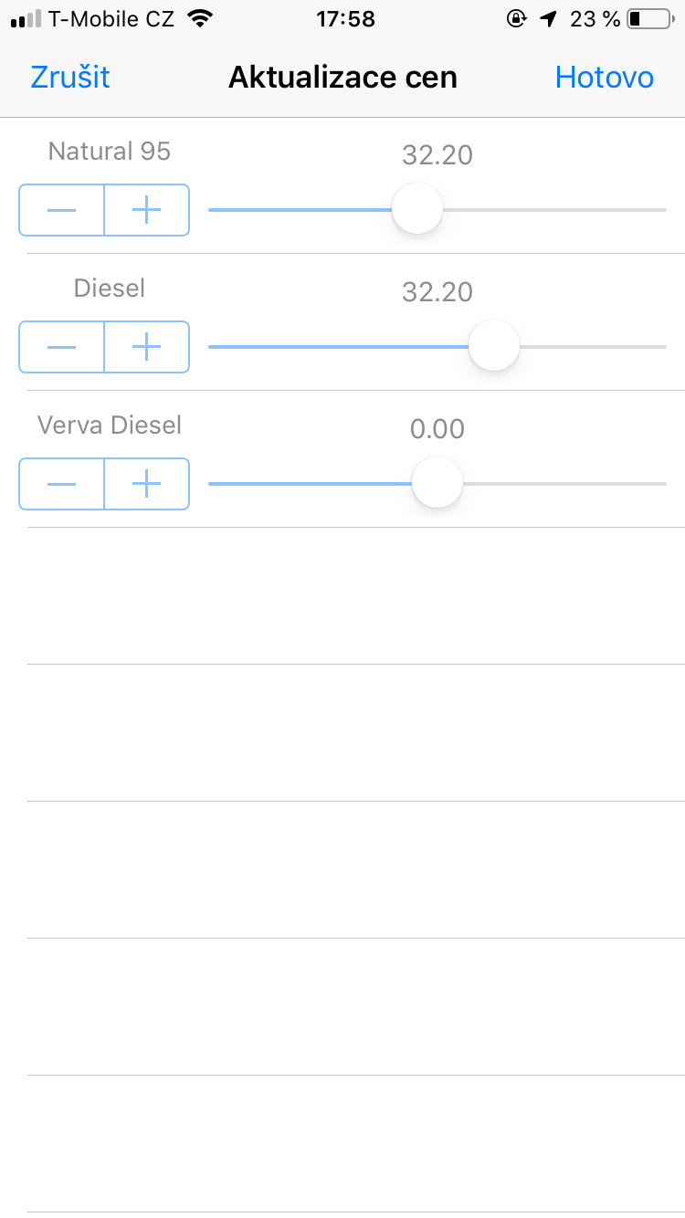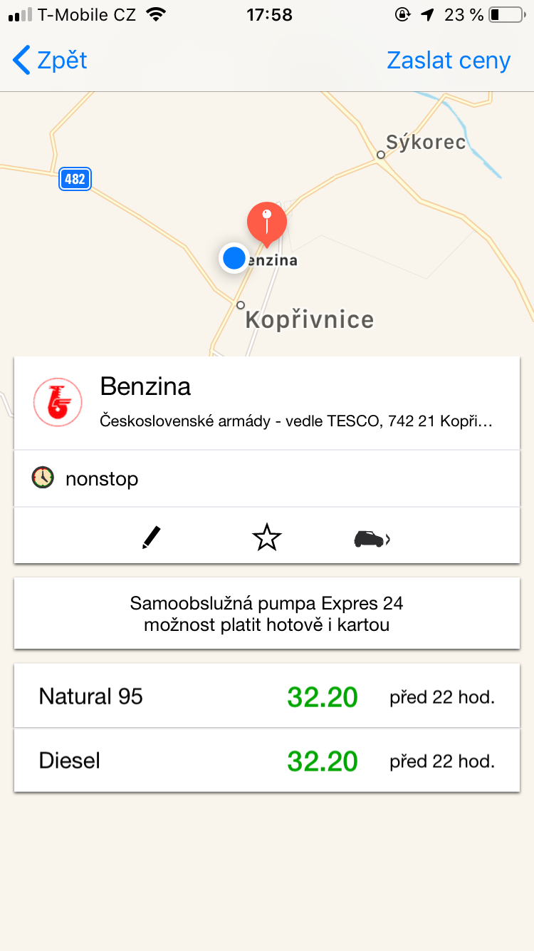 Nastavení preferovaného paliva se hodí především pro rychlý přehled, avšak pokud si chcete zobrazit ceny všech paliv, stačí si určitou čerpací stanici rozkliknout. Po rozkliknutí se zobrazí poloha čerpací stanice včetně adresy, dále její otevírací doba, doplňující informace a samozřejmě ceny paliv, které stanice nabízí. Přispět samozřejmě můžete i vy a pokud zaznamenáte změnu ceny paliva, stačí v pravém horním rohu kliknout na tlačítko Zaslat ceny. Poté jednoduše pomocí posuvníků nastavte momentální ceny a klikněte na Hotovo.