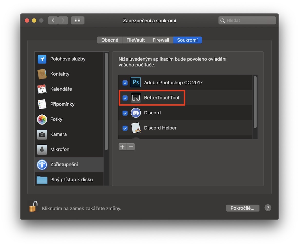Jelikož Apple možnost volby upozornění nedal, musíme sáhnout po programu třetí strany. Abychom si mohli nastavit libovolné upozornění před vybitím, je nutné si stáhnout program BTT (BetterTouchTool) z tohoto odkazu. Program je k dispozici v trial verzi na 45 dní, jakmile 45 dnů vyprší, tak si jej budete muset zakoupit za 6.5$. Po stažení program samozřejmě klasicky nainstalujeme. Po spuštění je nutné potvrdit několik oken a taktéž povolit BTT přístup k ovládání počítače. V tomto případě vás aplikace přímo navede do předvoleb systému, kde už se poté pouze stačí autorizovat a zaškrtnout políčko u BetterTouchTool.