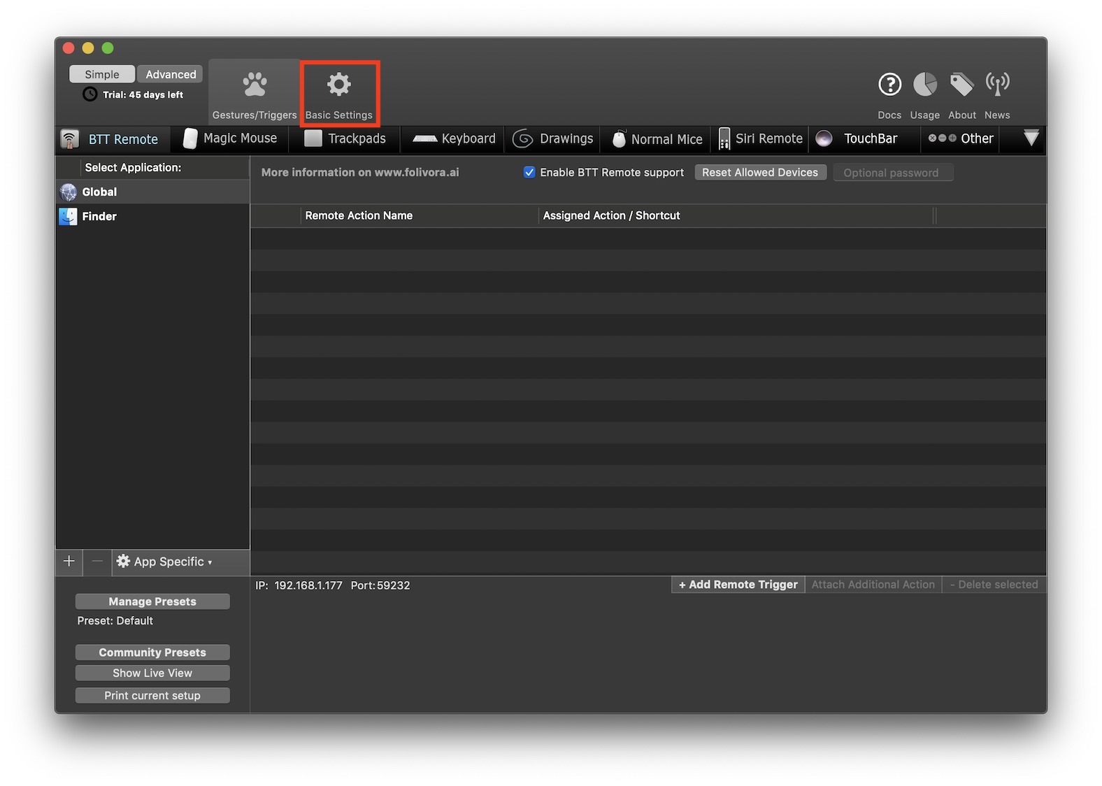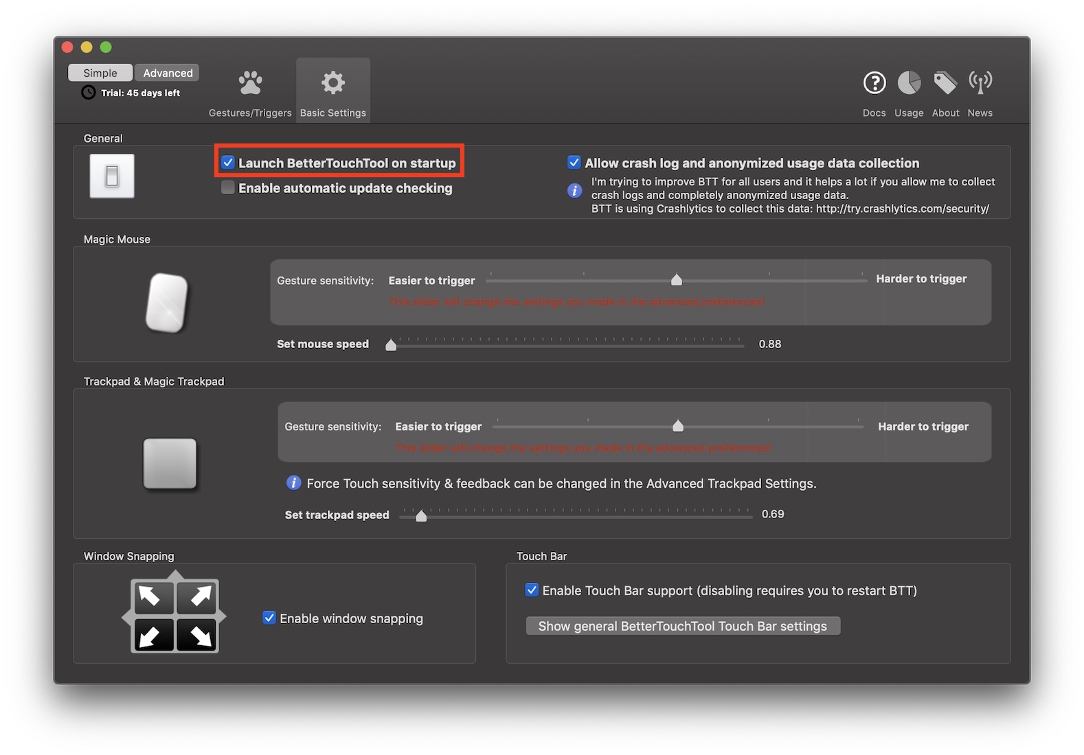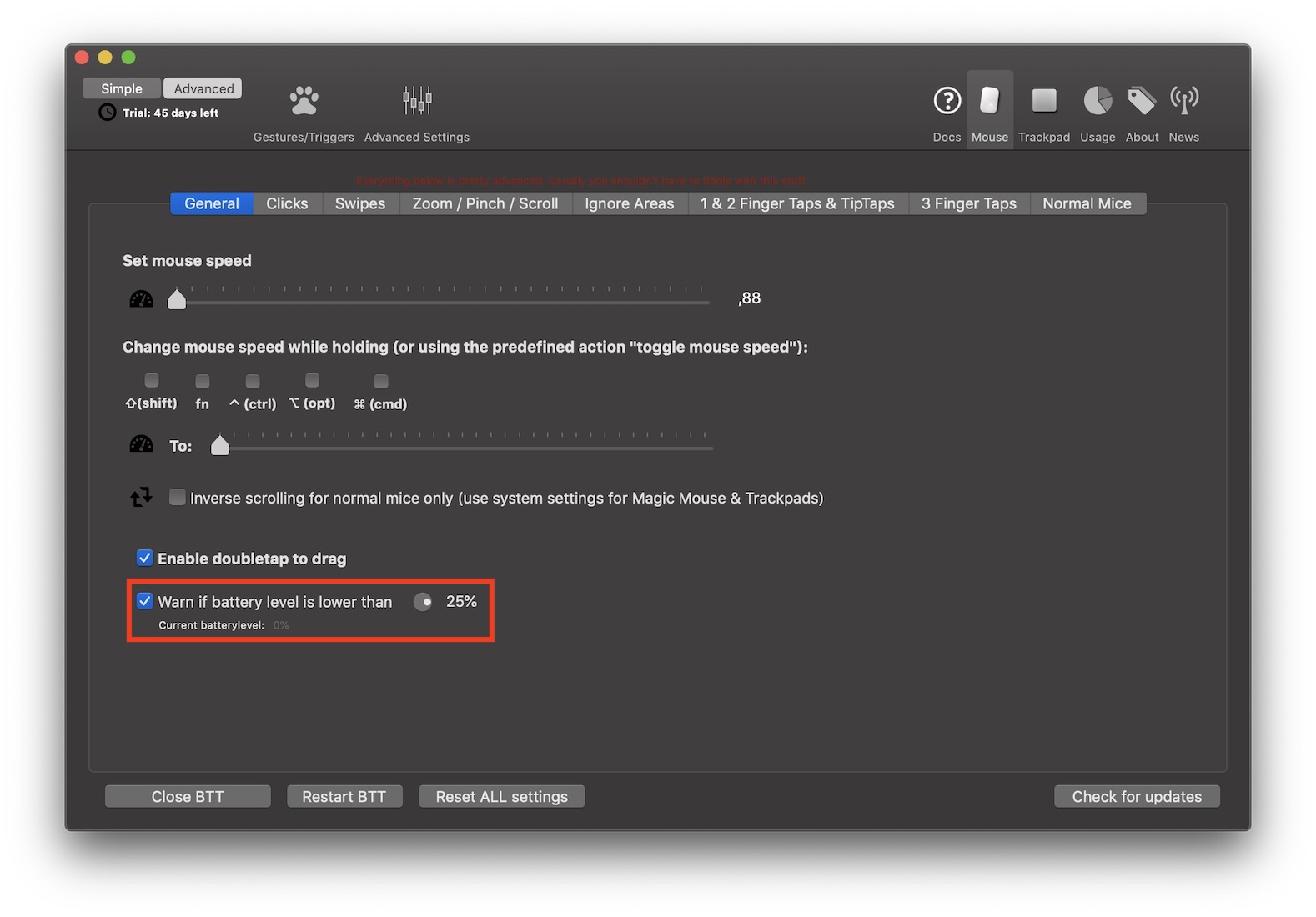 Jakmile se proklikáme úvodními okny BTT, v levé horní části okna klikneme na tlačítko Basic Settings. Zde zaškrtneme možnost Launch BetterTouchTool on startup, čímž zajistíme, že se BTT automaticky spustí po každém startu Macu. Poté se opět zaměříme na levou horní část okna a přepneme se do Advanced nastavení. Poté v pravém horním rohu klikneme na položku Mouse. V dolní části okna se nachází možnost Warn if battery level is lover than, kterou zaškrtneme. Poté si pomocí kuličky vedle možnosti nastavíme procenta podle toho, kdy chceme dostat upozornění na stav baterie v Magic Mouse. Osobně volím hodnotu 25 %, která je nastavena i ve výchozím nastavení.