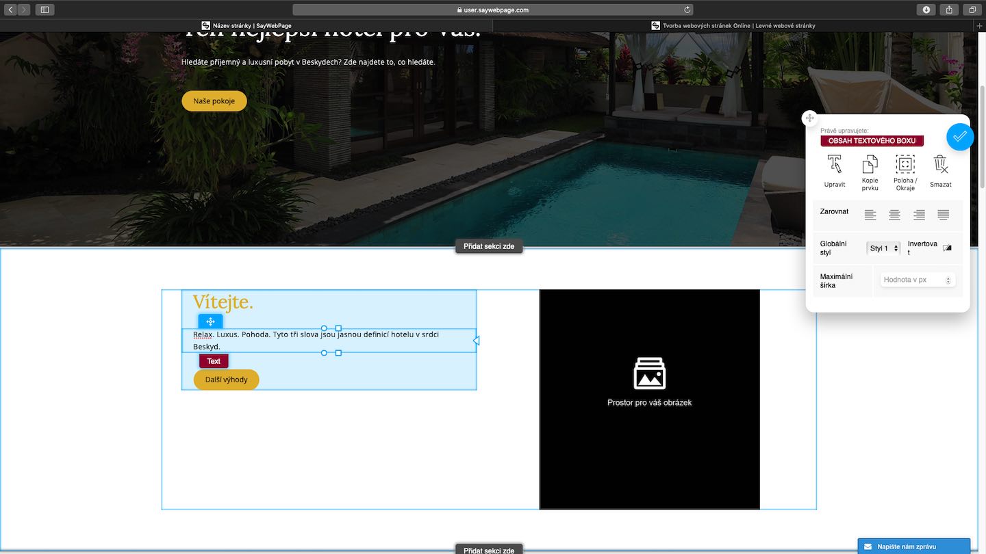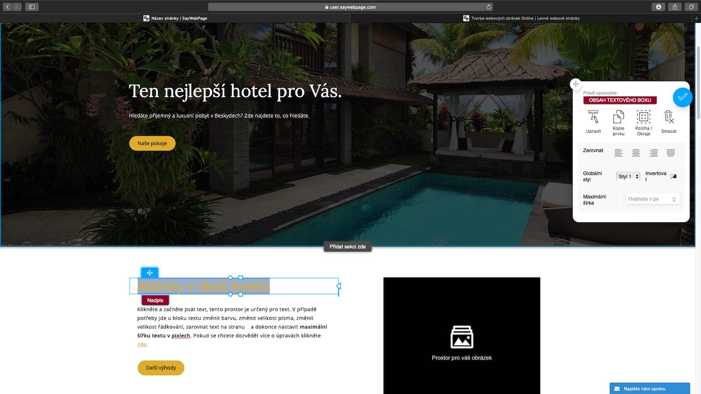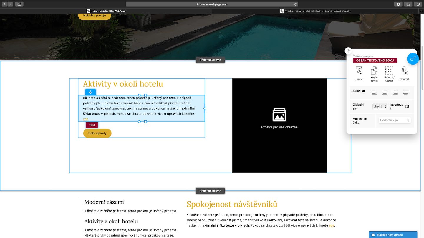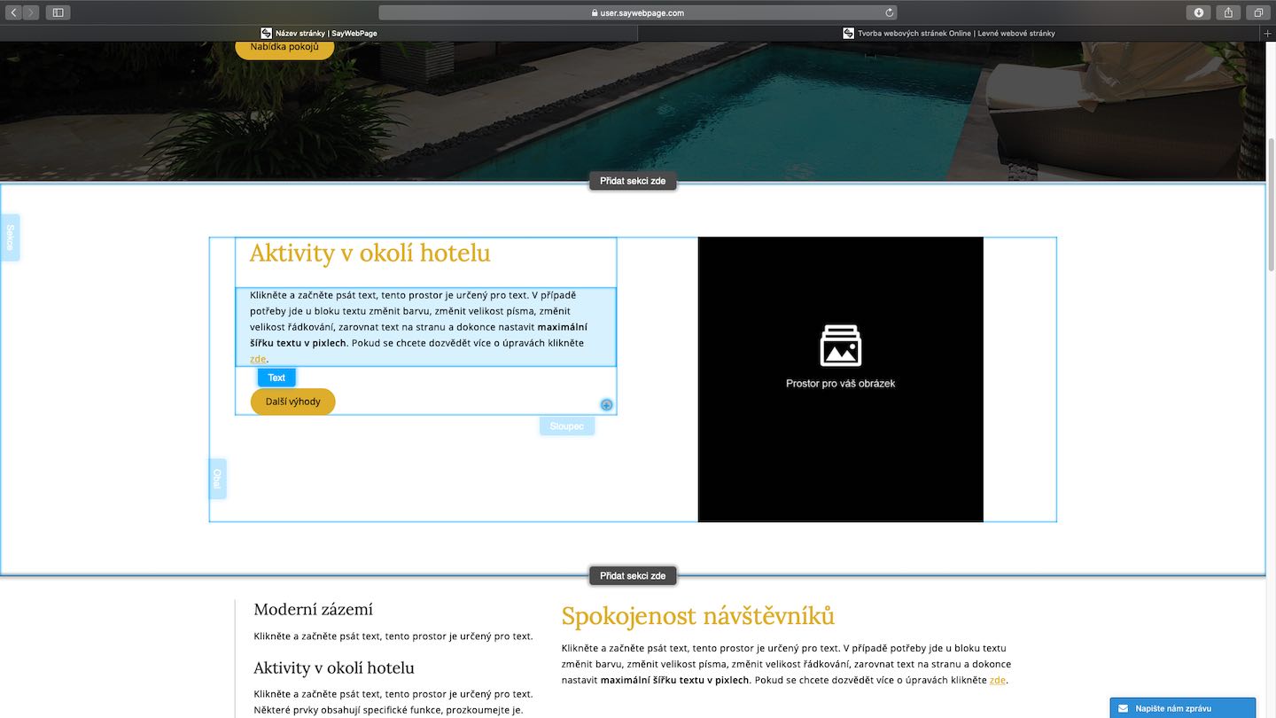 Musím říct, že používání služby Saywebpage je naprosto fantastické. I přesto, že jsem zastáncem HTML a tvořím webové stránky, tak musím uznat, že Saywebpage se opravdu povedlo a bude se vám líbit především tehdy, kdy neumíte programovat a „psát kód“. Prostředí Saywebpage je naprosto intuitivní a jednoduché – sžijete se s ním během několika vteřin. V horní části se nachází ovládací panel, díky kterému můžete jednoduše vracet kroky, když se vám něco nepovede – a naopak také provádět kroky vpřed. Samotná úprava webu probíhá velice jednoduše – jak už jsem několikrát zmínil, prostě jen klikáte, přepisujete či vkládáte obrázky. Saywebpage je navržen tak, aby byla tvorba webu opravdu jednoduchá, což můžu jen a jen potvrdit. Nebojím se navíc říct, že profesionálně vypadající web můžete mít hotov v řádech desítek minut.