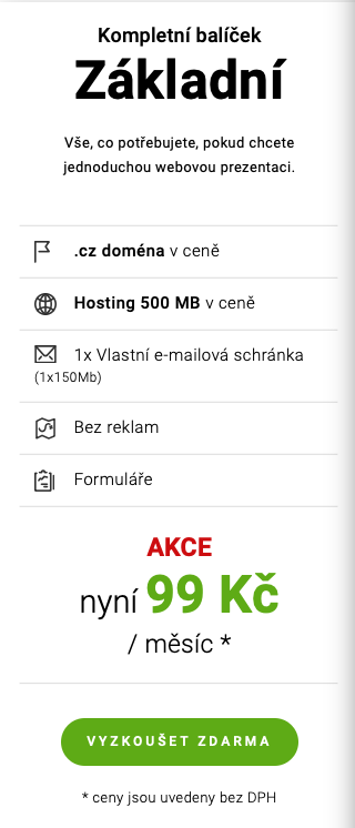 Základní balíček je určený především pro jednoduchou webovou prezentaci. Za cenu 1.188 Kč bez DPH ročně získáte: