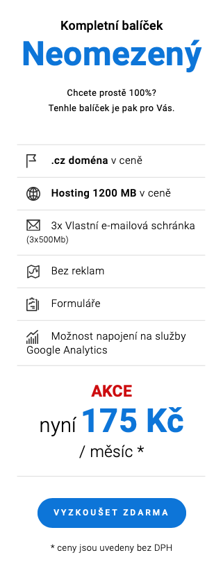 Neomezený balíček je prostě 100%. Vše, co můžete potřebovat i pro složitější webové stránky, vám poskytne právě neomezený balíček. Za cenu 2.100 Kč bez DPH ročně tak získáte:
