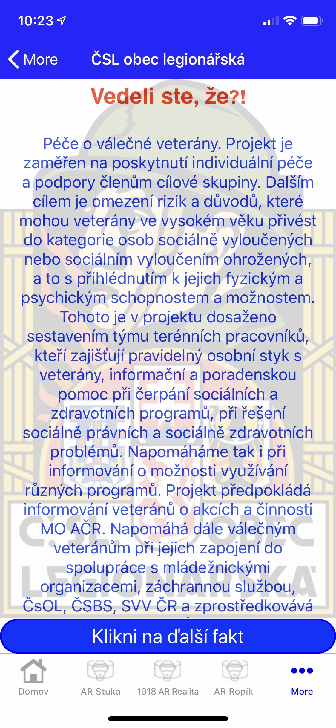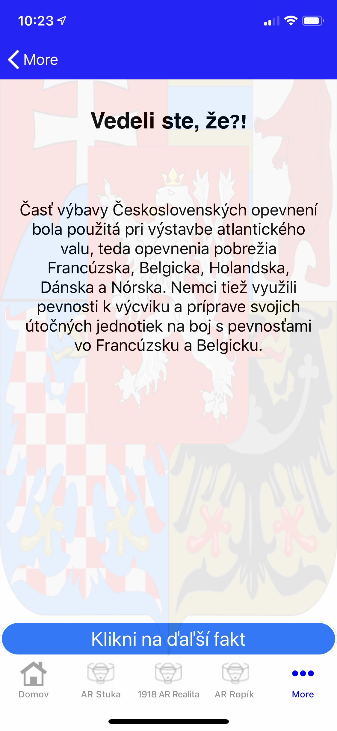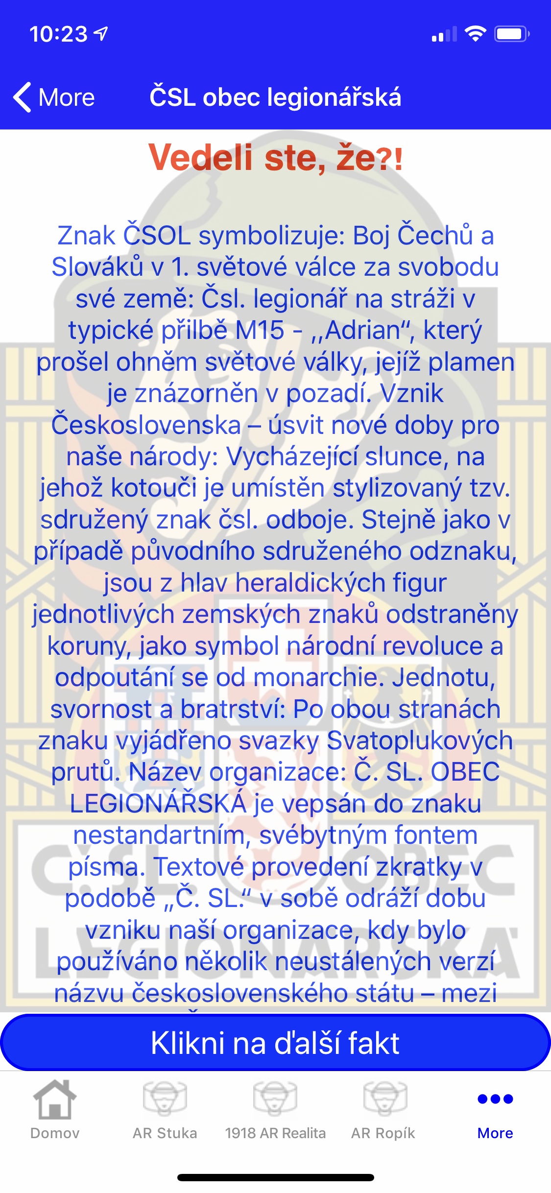 Mě osobně se velmi líbí sekce Další (čili More), ve které se můžete dozvědět právě spousty historických zajímavostí například o legionářích, 1. a 2. světové válce či vzniku státu. Milovníci historie pak ocení i sekci Akce a události, která vás informuje o různých akcích zaměřených právě na toto historické období v České republice. Pěkným bonusem je pak i AR, které je však zatím spíše v plenkách. Určitě ale potěší minihra, ve které sestřelujete koule s letadly. Jasně, zázračnou grafiku nečekejte, určitě vás ale na pár vteřin či minut zabaví.