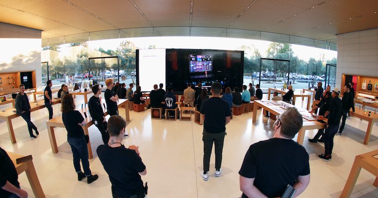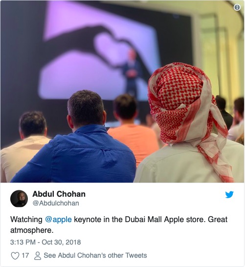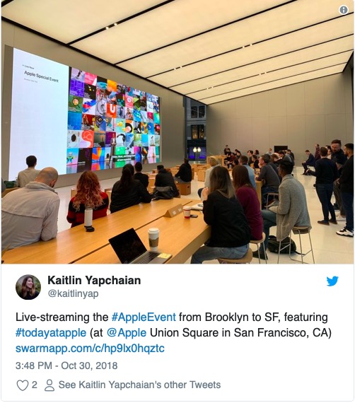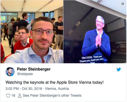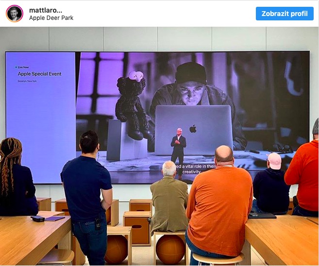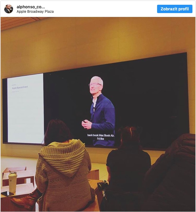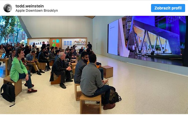 Na 60 Apple Storů v mnoha zemích světa včera odpoledne nabídlo svým návštěvníkům sledovat přímý přenos keynote na velkých obrazovkách uvnitř obchodu. Tuto možnost samozřejmě mnoho z nich využilo a zhruba hodinu a půl dlouhou prezentaci si vychutnalo v obležení zaměstnanců Applu a dalších fanoušků se shodnou zálibou. Mnozí z nich se lehce netradičním sledováním keynote pochlubili i na sociálních sítích, díky čemuž máme možnost atmosféru z obchodů alespoň částečně nasát.