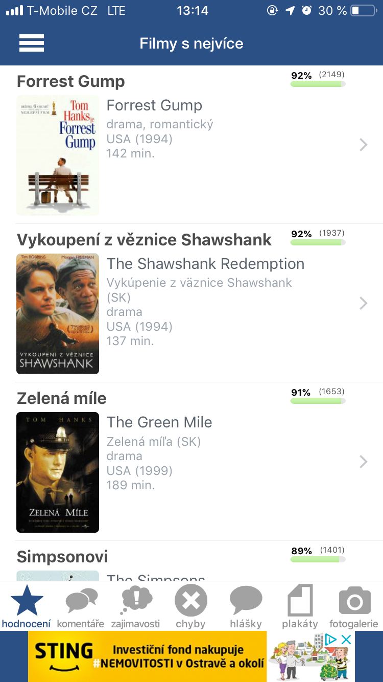 Velice zajímavá je poté skupina Program kin. Zde si můžete nechat zobrazit, jaké filmy jsou právě v kinech. Nesmíme opomenout také zobrazení programu kin pro více než 300 kin v České republice. A pokud nevíte, do kterého kina chcete dnes vyrazit, určitě vám skvěle poslouží kolonka Kina v okolí. Stejně jako v případě TV programů si můžete zvolit vaše oblíbená kina. Součástí aplikace FDb.cz jsou dále žebříčky nejlepších filmů a seriálů s možností zobrazení filmů, které mají největší hodnocení, nejvíce komentářů, zajímavostí, chyb atp.