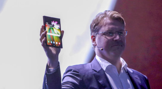 Na první ukázku ohebného smartphonu jsme si museli počkat téměř až do konce zhruba hodinu a půl dlouhé prezentace Asi patnáct minut před jejím koncem se totiž začali představitelé Samsungu poměrně zajímavě ve svých projevech stáčet k displejům a především pak pokroku, kterých společnost v jejich výrobě za poslední roky dosáhla. V tuto chvíli už bylo každému jasné, že Samsung nenápadně vyšlapává cestičku pro nový skládací smartphone, který skutečně nakonec ukázal. Ten jsme sice viděli pouze zahalený tmou, jelikož se jednalo o pouhý prototyp, už nyní však vypadal poměrně zajímavě.
