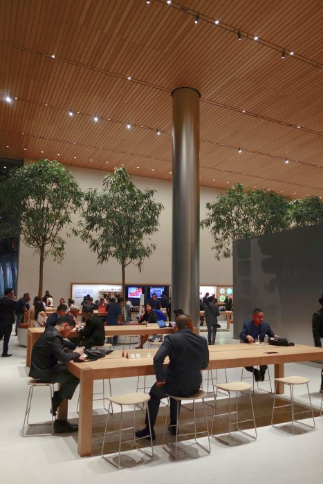 Apple Store má dva vchody, vnitřní a vnější. Strop je poměrně klasicky vyhotoven z rovnoběžných dřevěných prken. K posezení je zde zákazníkům připraveno velké množství stolů taktéž ze dřeva. V obchodě je rovněž k vidění dvanáct listnatých stromů, jejichž zasazení do celkové kompozice mohlo být dle mého názoru lepší. Osobně se mi mnohem více líbilo umístění a nasvícení japonského javoru v Apple Storu v Seattlu. Zdi jsou vyhotoveny z kamene a znamenitě přiléhají k obrovským skleněným fasádám. K východu (nebo od vchodu) mohou zákazníci zamířit za pomoci několika eskalátorů. Samozřejmostí je přítomnost videostěny s rozlišením 6k.