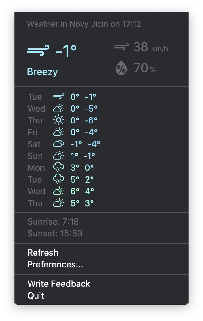 Weather Indicator je jednoduchá aplikace, pomocí které můžete zobrazit jednoduchou předpověď počasí. Aplikaci stačí jednoduše pomocí odkazu níže stáhnout, nainstalovat a spustit. Po spuštění si můžete zvolit, zda-li chcete polohu načíst automaticky, či ručně. Ikona ve stavovém řádku zobrazuje momentální teplotu a podmínky, po rozkliknutí ikony si můžete jednoduše nechat zobrazit rychlost větru, pravděpodobnost deště či desetidenní předpověď. Jedinou nevýhodou je, že aplikace se neaktualizuje automaticky – vždy je tedy nutné ikonu ve stavovém řádku rozkliknout a zvolit možnost Refresh. Zároveň také nesmí chybět možnost změny ze stupňů Celsia na stupně Fahrenheita.