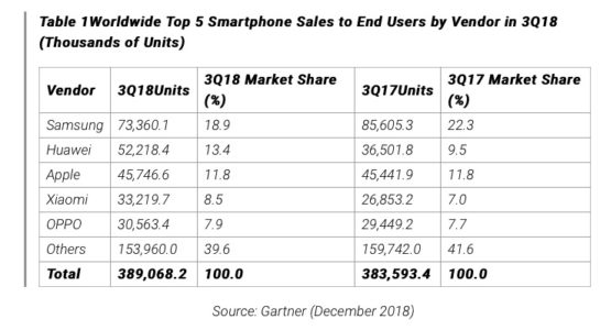 Zatímco se kalifornský gigant v prodejích a podílu oproti loňsku prakticky neposunul, jeho úhlavní konkurent – jihokorejský Samsung – má alespoň dle výzkumu Gartneru důvod k zamyšlení se. Zatímco v roce 2017 prodal ve třetím čtvrtletí na 85,6 milionů smartphonů, což představovalo 22,3 % podíl na trhu, ve stejném období letos prodal “jen” 73,3 milionů smartphonů a jeho podíl na trhu tak klesl na 18,9 %. Lví podíl na tom má hlavně čínský Huawei a částečně i Xiaomi. První zmiňovaná společnost dokázala prodat meziročně o 15,7 milionu smartphonů více a zastavila se tak na čísle 52,2 milionů kusů. Xiaomi se pak z loňských 26,8 milionů kusů vyšvihlo na letošních 33,2 milionů kusů. Za zvýšené prodeje vděčí obě společnosti především své cenové politice, se kterou se ostatní výrobci příliš nemohou rovnat.