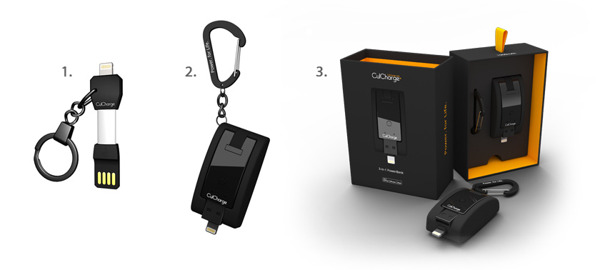 Jedná se o nejmenší nabíjecí kabel (1.) a nejmenší externí nabíječku (2.) na trhu. Navíc jsou tyto produkty hned přizpůsobené jako přívěsek na klíče. U produktu CulCharge externí nabíječka 3v1 se jedná io opravdu velmi pěkné balení produktu (3.)