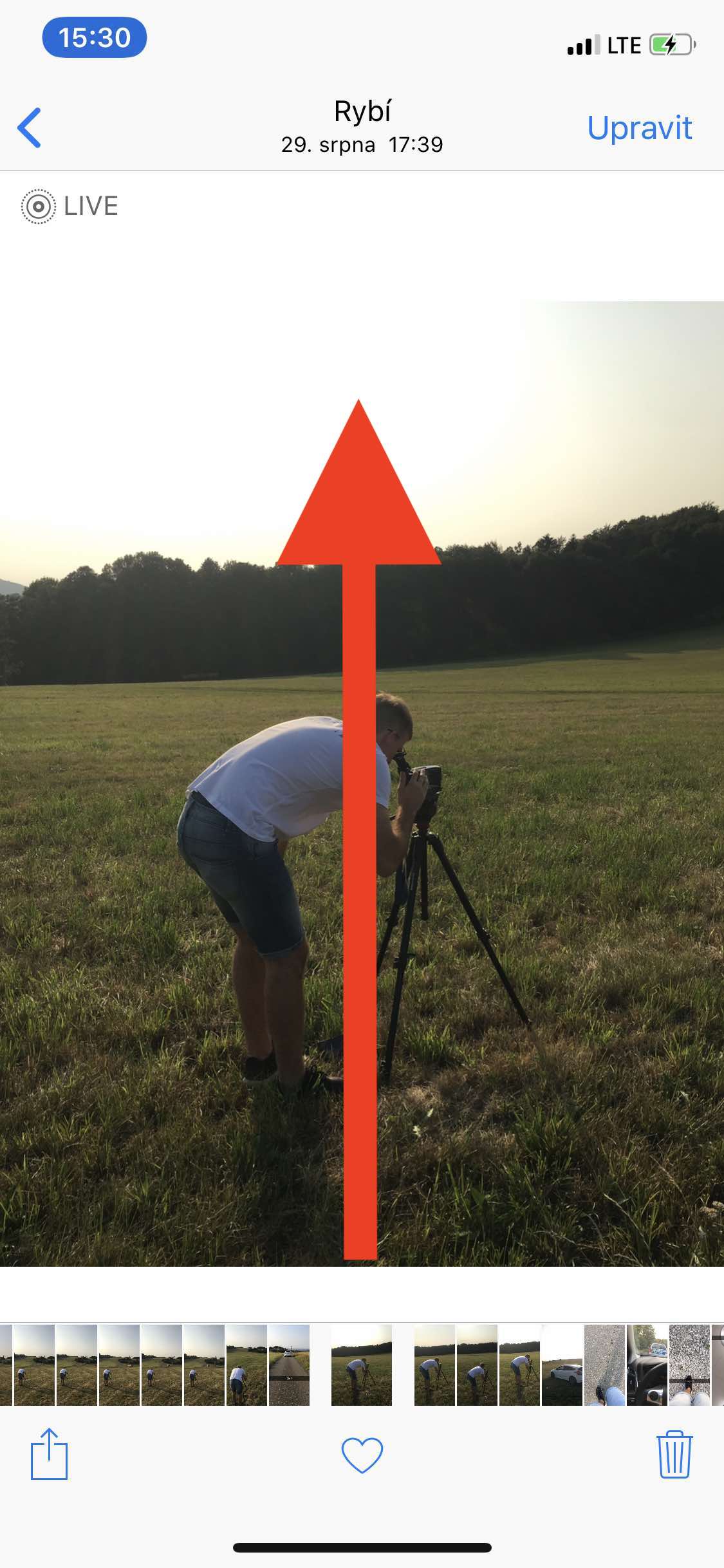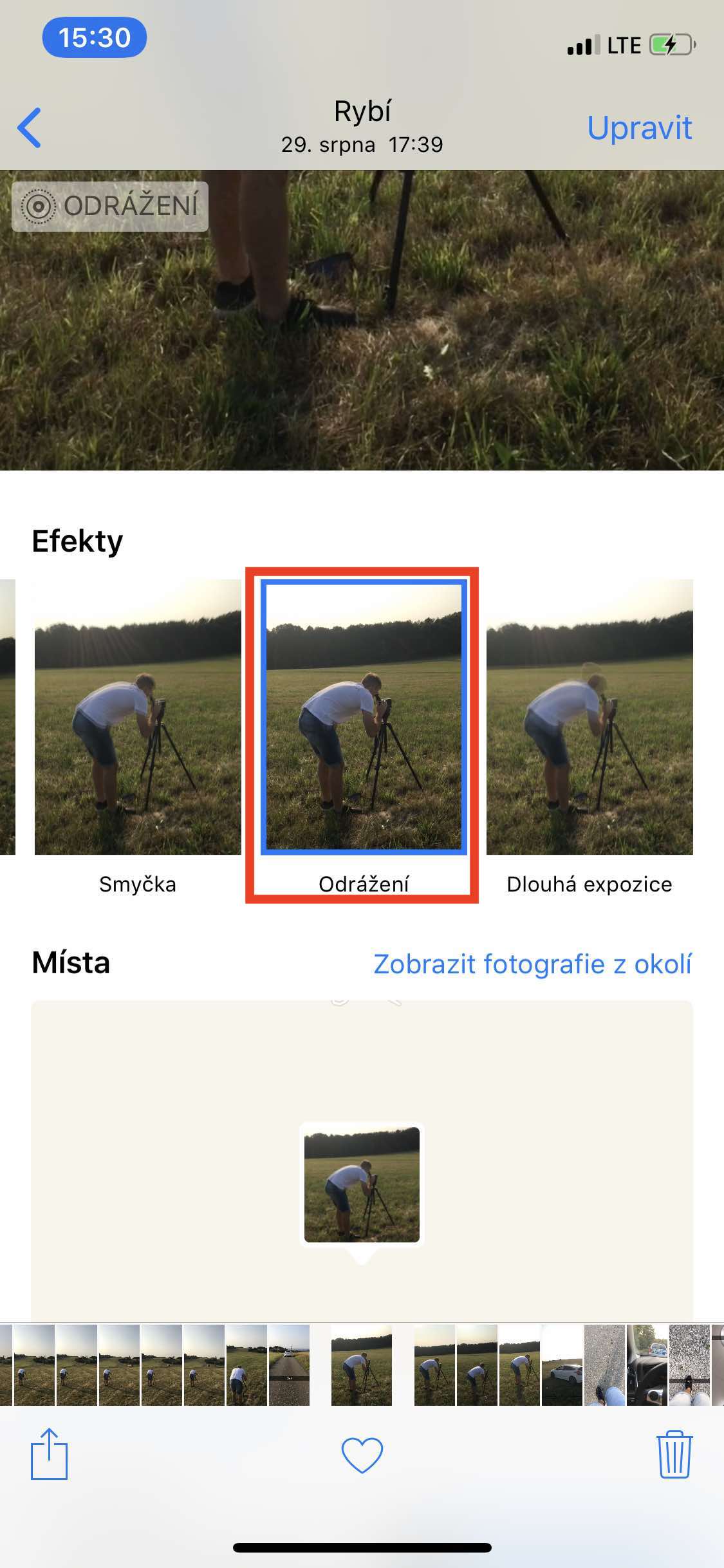 Nejprve si v našem iOS zařízení, tzn. v iPhonu či iPadu, najedeme do nativní aplikace Fotky. Zde si vyberemerozklikneme fotografii, na které je funkce Live Photo aktivována. Jakmile fotografii rozklikneme, tak přes ní přejedeme zdola nahoru prstem. Zobrazí se okno s efekty, kde vybereme efekt Odrážení a aplikujeme jej na fotografii. Nyní už pouze stačí najet do nativní aplikace Zprávy a fotku s efektem poslat uživateli s Androidem. Live Photo se v tomto případě pošle jako MMSka ve formátu MP4.