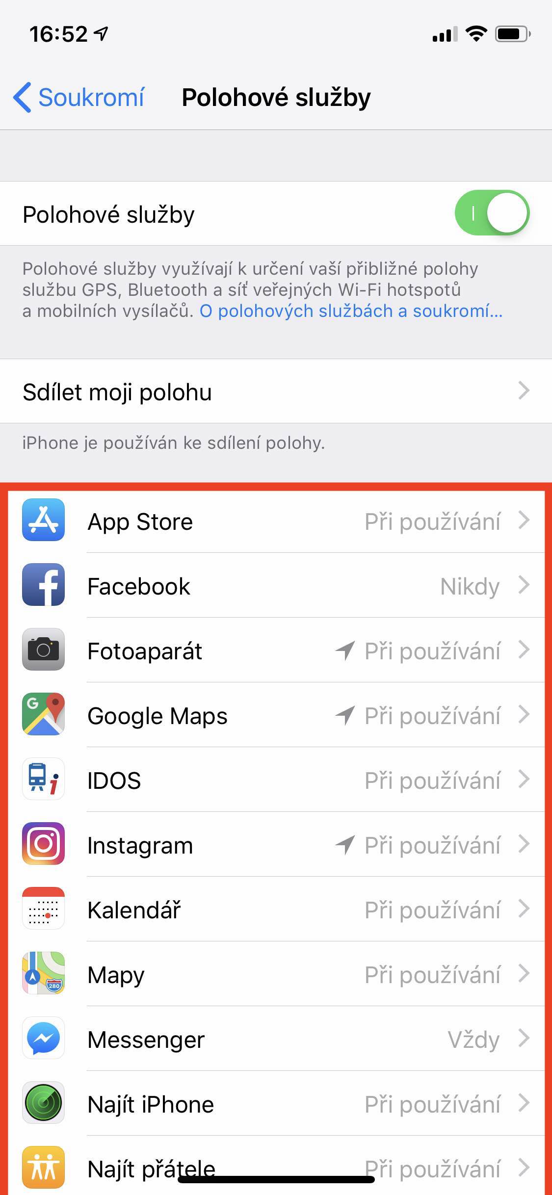 • Při používání – v tomto případě má aplikace k vaší poloze přístup jen tehdy, kdy ji máte spuštěnou