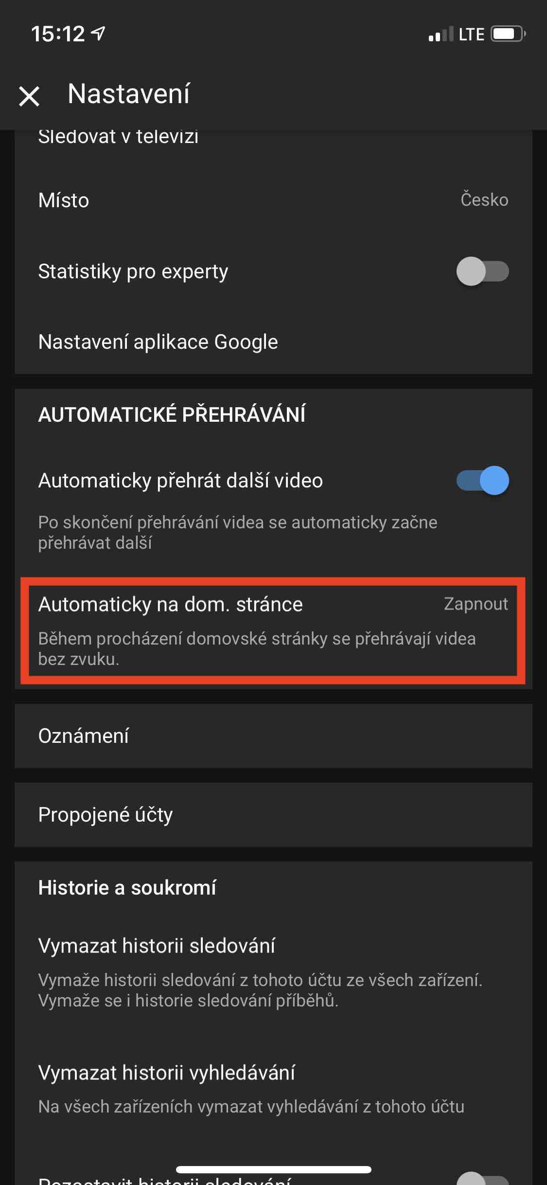 Na našem iOS zařízení, tzn. na iPhonu či na iPadu, přejdeme do aplikace YouTube. Zde poté v pravém horním rohu klikneme na ikonku našeho profilu. Objeví se nabídka, ve které zvolíme téměř na samotném konci možnost Nastavení. V novém okně, které se zobrazí, sjedeme trochu níže, dokud nenarazíme na sekci Automatické přehrávání. Zde rozklikneme možnost Automaticky na dom. stránce a z nabídky si zvolíme, zda-li chceme automatické přehrávání aktivovat pouze na Wi-Fi, a nebo jej můžeme kompletně vypnout.