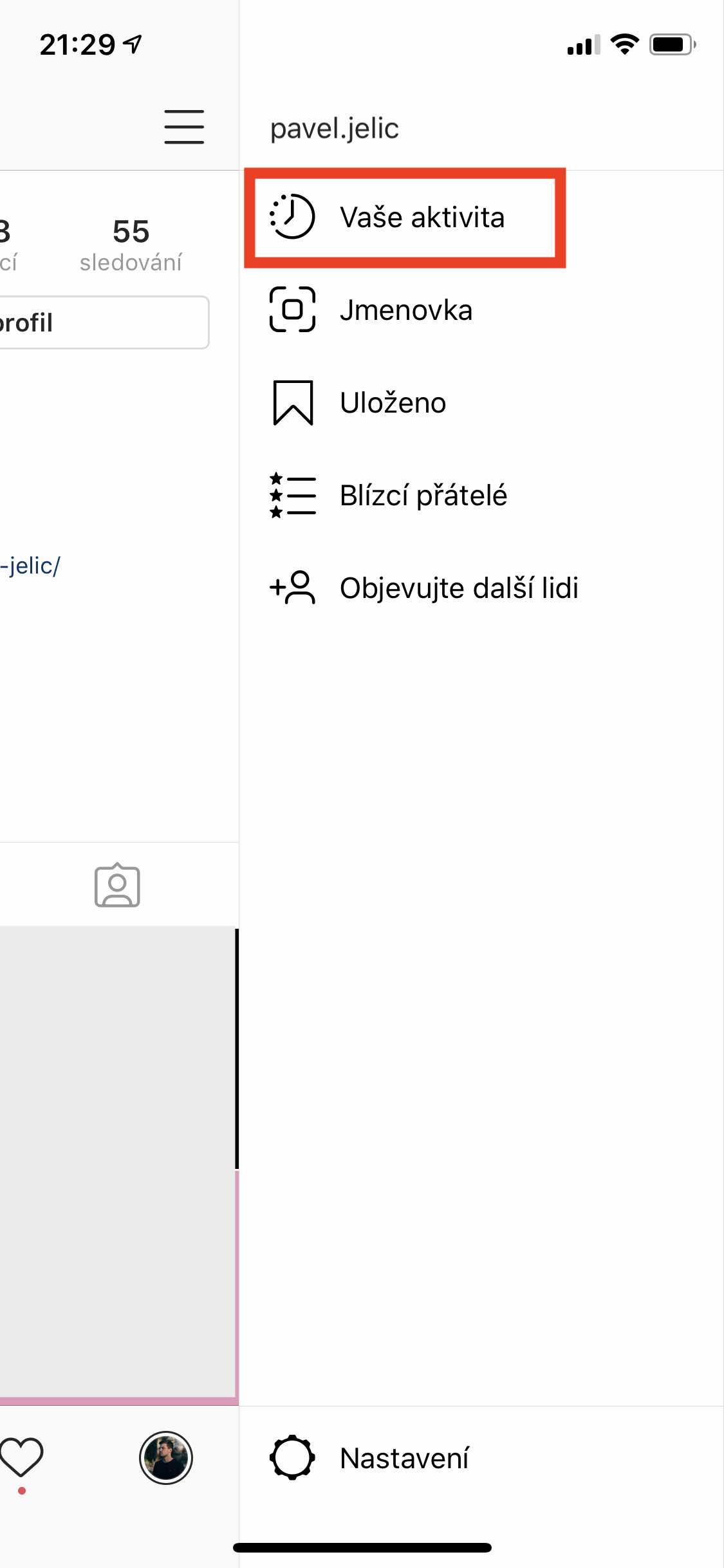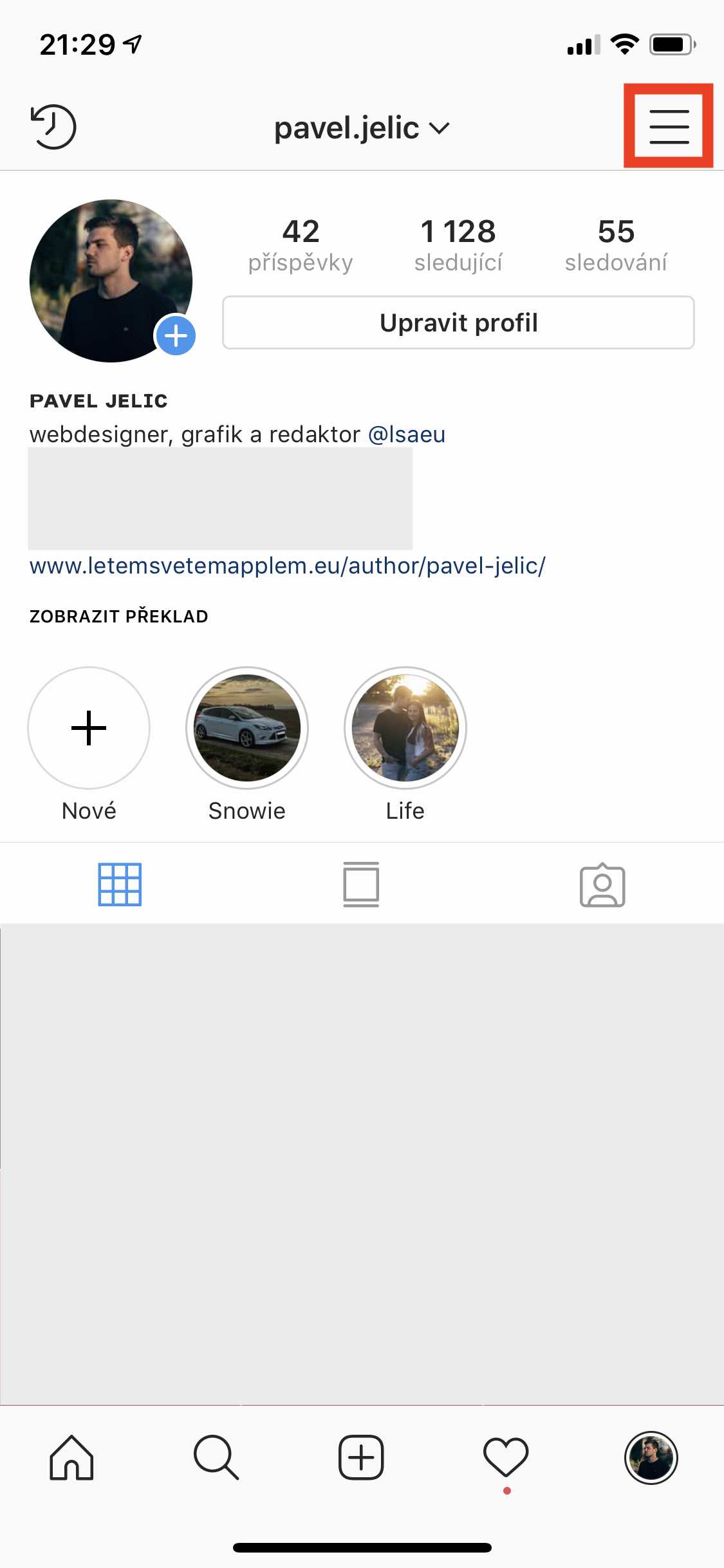 Na našem iOS zařízení, tzn. na iPhonu či na iPadu, otevřeme aplikaci Instagram. Poté se v dolním menu přesuneme pomocí ikony fotografie na náš profil. V pravém horním rohu obrazovky poté klikneme na ikonu tří čar, která rozevře menu. Z tohoto menu vybereme hned první možnost, a to Vaše aktivita. Zobrazí se okno, ve kterém už se zobrazují veškeré informace – tzn. průměrný čas denně strávený na Instagramu a pod ním graf, který po tapnutí zobrazí aktivitu v určitý den. Níže si poté můžete nastavit denní připomenutí, o kterém jsem mluvil v úvodu, a zároveň také nastavení upozornění, kde si můžete jednoduše navolit, která upozornění vám mají z Instagramu chodit.