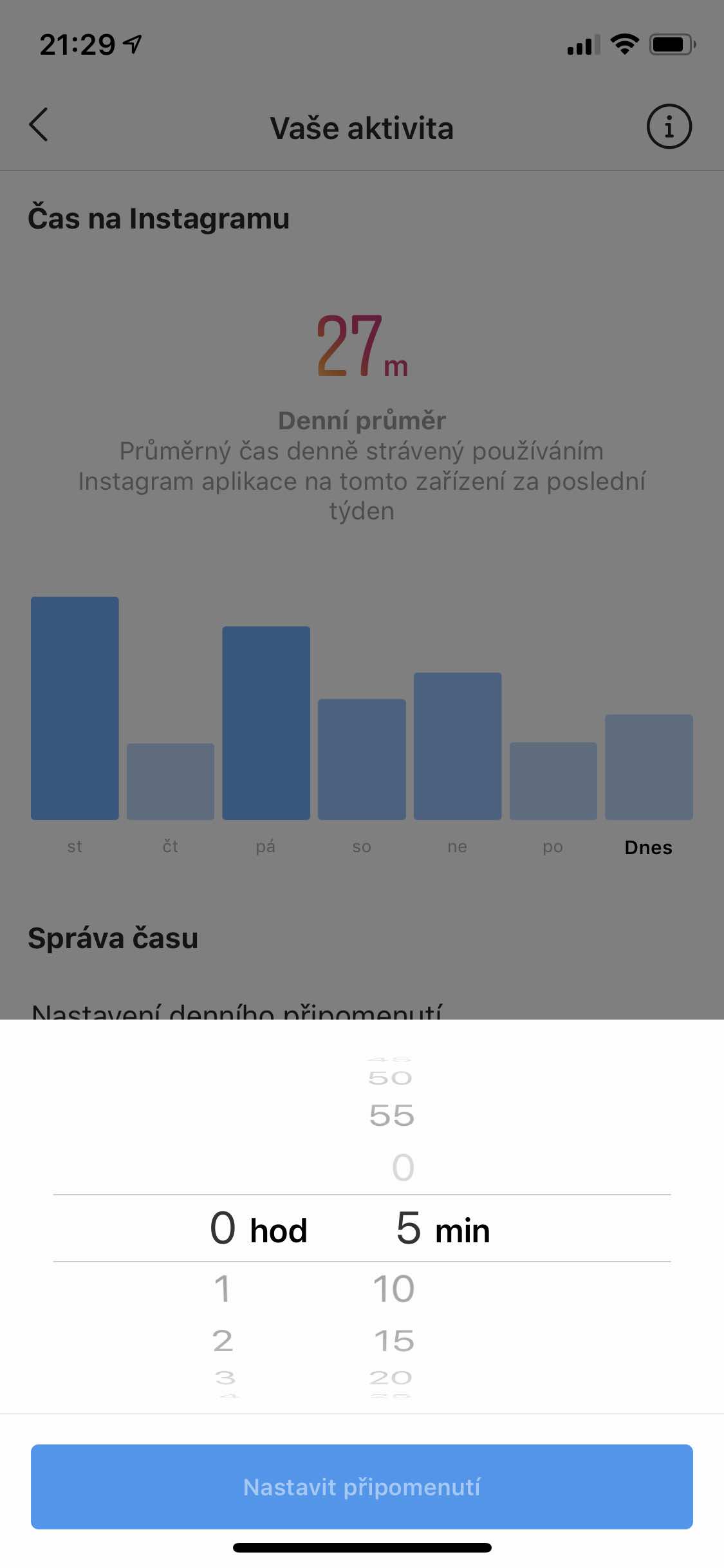 Instagram přidal do své aplikace po vzoru funkce Čas na obrazovce funkci, pomocí které si můžete zobrazit podobné informace. Konkrétně se jedná o průměrnou dobu, kterou denně strávíte na Instagramu. Zároveň si můžete zobrazit i konkrétní čas až sedm dní dozadu, který jste na Instagramu za určitý den strávili. Nechybí samozřejmě funkce, díky které si můžete nastavit upozornění, které vám přijde tehdy, kdy překročíte nastavenou časovou hranici, kterou chcete maximálně na Instagramu denně strávit. Jak se tedy jednoduše do tohoto nastavení dostat?