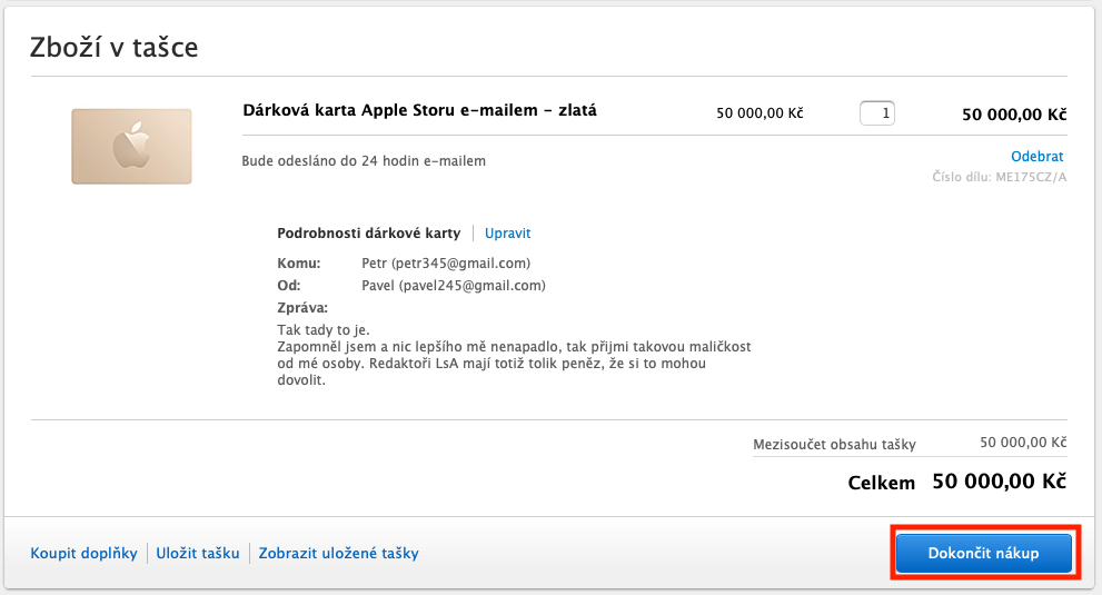 Apple si pro darování dárkových karet připravil speciální stránku, kterou můžete rozkliknout pomocí tohoto odkazu. Na stránce poté stačí sjet o něco níže a zvolit možnost Dárková karta e-mailem. Poté už stačí pouze vybrat vzhled karty, zadat hodnotu daru a samozřejmě text e-mailu, který obdarované osobě dorazí. Poté už stačí kliknout na modré tlačítko Přidat do tašky. Stránka vás přesměruje do košíku, ve kterém si můžeme zkontrolovat správnost údajů. Poté klikneme na tlačítko Dokončit nákup. Pokud ještě nejsme přihlášení, tak se přihlásíme. Nyní už jen stačí zadat údaje o platbě, potvrdit obchodní podmínky a je hotovo.