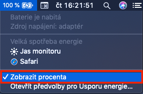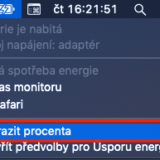Tak stejně, jako v iOS, tak i v macOS se v defaultním nastavení neobjevují u baterie procenta. Věřím, že procenta zobrazující momentální nabití baterie využijí naprosto všichni. Pro zobrazení procent u baterie stačí v horní liště kliknout na ikonu baterie a z menu, které se zobrazí, vybrat možnost Zobrazit procenta.