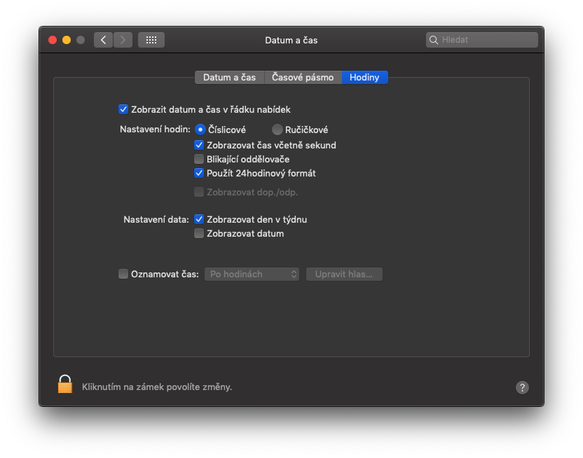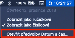To samé, jako v minulém tipu, platí i pro datum. Osobně mám rád, když mám přehled o čase. Naštěstí v macOS existuje vcelku dost možností, jak si zobrazení data a času můžete upravit. Na mém MacBooku si nechávám zobrazovat dnešní den, společně s časem v hodinách, minutách a sekundách. Pro změnu stačí v horní liště kliknout na datum/čas a z menu vybrat možnost Otevřít předvolby Datum a čas. Objeví se okno, ve kterém už si jednoduše můžete nastavit předvolby zobrazování času a data podle vlastního gusta.
