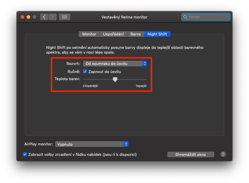 V macOS si opět podobně, jako v iOS, můžete nastavit funkci Night Shift. Night Shift slouží pro redukci modrého světla vydávaného monitorem. Modré světlo má ve tmě za následek unavené oči, což se dále projevuje na nespavosti a nekvalitním spánku. Vsadím se, že ani jednu z těchto možností nechcete zažít, a proto vám silně doporučuji si Night Shift nastavit. Pro nastavení Night Shiftu otevřeme Předvolby systému a v okně rozklikneme možnost Monitory. Poté se v horním menu přepneme do záložky Night Shift a zvolíme si, jak jej chceme aktivovat.