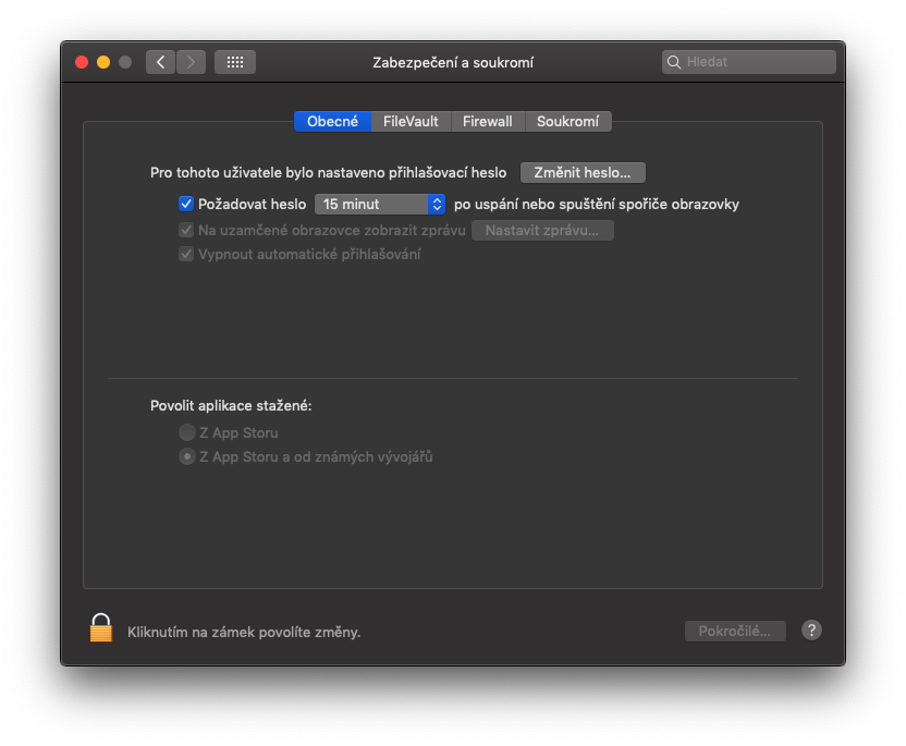 Pokud si chcete nastavit, po kolika minutách nečinnosti bude Mac či MacBook požadovat heslo, tak postupujte následovně. Přejdeme do Předvoleb systému pomocí Apple loga v levém horním rohu. Objeví se okno, ve kterém rozklikneme možnost Zabezpečení a soukromí a ujistíme se, že se nacházíme v záložce Obecné. Zde už si pouze stačí v prvním řádku vybrat, po kolika minutách nečinnosti bude Mac vyžadovat heslo.