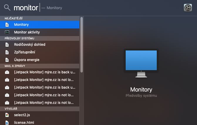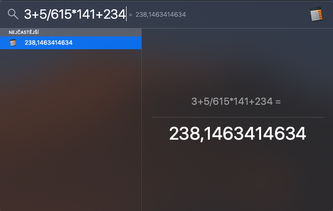Spotlight je jednou z nejlepších funkcí, kterou Mac disponuje a osobně jej využívám každý den. Jedná se o takový Google přímo ve vašem Macu. Pokud potřebujete něco spočítat, stačí to napsat do Spotlightu. Pokud něco hledáte, ať už na internetu a nebo v počítači, opět se můžete obrátit na Spotlight. Existuje opravdu mnoho možností, kdy můžete Spotlight využít, a kdybych tady měly vyjmenovávat všechny, tak tady jsem další rok. Pro aktivaci Spotlightu stačí kliknout v pravém horním rohu obrazovky na ikonu lupy a nebo můžete použít klávesové zkratky Command + Mezerník.