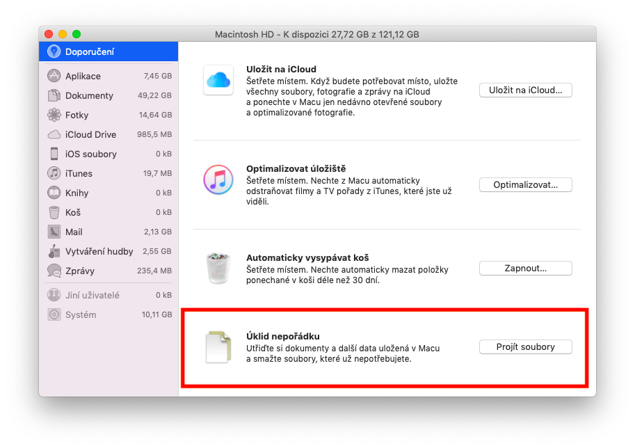 Pokud vlastníte Mac s macOS Sierra a novějším, máte pro svůj vánoční úklid skvělého spojence: funkci Úklid nepořádku. Stačí v levém horním rohu kliknout na Apple Menu (ikonka nakousnutého jablíčka) -> O tomto Macu -> Úložiště -> Správa. Po kliknutí na Úklid nepořádku můžete snadno zjistit, které soubory vám zabírají nejvíce místa. Můžete si zde také nastavit automatické vysypávání koše nebo optimalizaci úložiště za pomoci iCloudu.