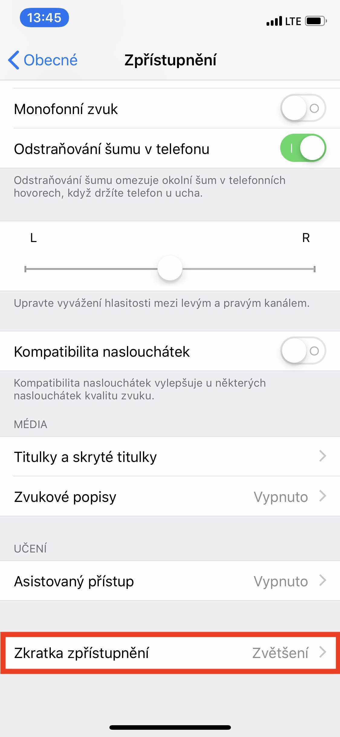 Na iPhonu X, XS nebo XS Max přejdeme do aplikace Nastavení, poté se přepneme do Obecných a opět do Zpřístupnění. Zde sjedeme na úplný konec a rozklikneme možnost Zkratka zpřístupnění a zaškrtneme možnost Zvětšení. A to je vše, nyní už stačí „vyjet“ z Nastavení.