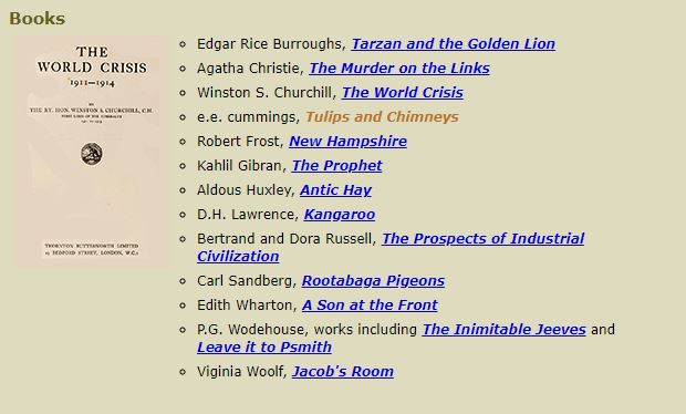 Od začátku tohoto roku se tak volným dílem stává například film The Pilgrim, který režíroval Charlie Chaplin. Dalšími filmy jsou The Covered Wagon či například The Ten Commandments s režisérem Cecilem B. DeMillem. Mezi knihy, na které se nevztahuje autorské právo, se nově dostala Agatha Christie s její The Murder on the Links, The World Crisis od Winstona S. Churchilla, Kangaroo od D.H. Lawrence a mnoho dalších. Autorské právo se týká také hudby a volným dílem je nově sedm hudebních nahrávek.