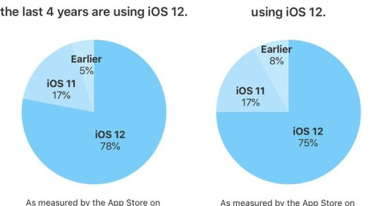 Že je iOS 12 velmi oblíbený dokazuje i fakt, že ve stejném období vloni byl jeho předchůdce nainstalován na pouhých 65 % zařízení, což lze přičítat právě jeho mizerné kvalitě. V porovnání s iOS 10 si pak nový iOS 12 vede zhruba stejně. “Desítku” mělo totiž 5. ledna 2017 nainstalovanou na 76 % aktivních zařízení, tedy jen zanedbatelně více.