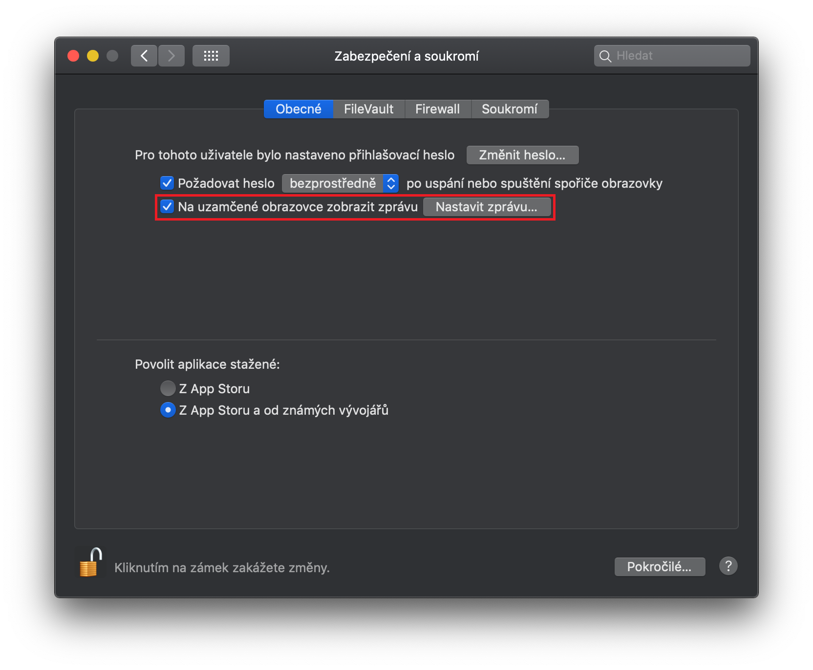 V minulých verzích macOS jste si mohli vložit text na uzamčenou obrazovku Macu skrze pár příkazů v Terminálu. Nyní už je to naštěstí o mnoho jednodušší a zprávu si můžete nastavit přímo v předvolbách vašeho Macu či MacBooku. V levém horním rohu obrazovky klikněte na Apple logo a z menu, které se zobrazí, rozklikněte možnost Předvolby systému… Poté přejděte do Zabezpečení a soukromí (první řádek, šestá ikona). Nyní se ujistěte, že se v horním menu nacházíte v záložce Obecné a pomocí zámku ve spodní části okna se autorizujte. Nyní už stačí pouze zaškrtnout možnost Na uzamčené obrazovce zobrazit zprávu. Samotnou zprávu si můžete nastavit po kliknutí na tlačítko Nastavit zprávu… Jakmile zprávu vložíte, tak už jen stačí, abyste stiskli tlačítko OK a je hotovo. Od teď se na uzamčené obrazovce vašeho macOS zařízení bude zobrazovat zpráva.