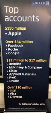 Apple používá velmi často pro přesun svých zaměstnanců služby leteckých společností. Asi takto by se dal shrnout text transparentu, který byl vyvěšen na mezinárodním letišti v San Franciscu společností United Airlines. Ze zveřejněných dat totiž vyplývá, že Apple za letenky v minulém roce utratil zhruba 150 milionů dolarů. Za Applem je v tomto žebříčku s velkým odstupem Google, Facebook a Roche s útratou zhruba 34 milionů dolarů. Uvedená statistika je navíc zhotovena jen a pouze z letů ze sanfranciského mezinárodního letiště. Po celém světě tak musí být útrata Applu ještě daleko větší.