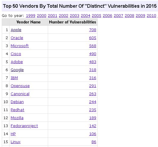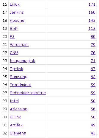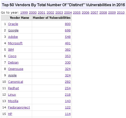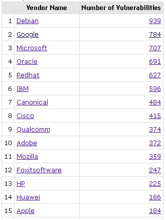 Tato databáze je v současnosti zřejmě tou nejpoužívanější a tak jsou data z ní nejvíce vypovídající. Navíc na adrese cvedetails.com naleznete mnoho statistických údajů, grafů a tabulek. Jednou z nich je i seznam 50 značek/firem, s největším počtem zranitelností v roce 2018. První, tedy nejhorší místo, obsadil oblíbený otevřený operační systém Debian s celkem velkým náskokem před druhým místem. Na něm se umístil Google, který předchozí rok skončil první (Debian byl za rok 2017  až desátý). Na stupně „vítězů“ se dostal ještě Microsoft, který je na třetím místě už druhý rok po sobě. V první desítce najdeme ještě Oracle, Redhat, IBM, Canonical, Cisco, Qualcomm a Adobe. Kompletní seznam najdete níže v galerii.