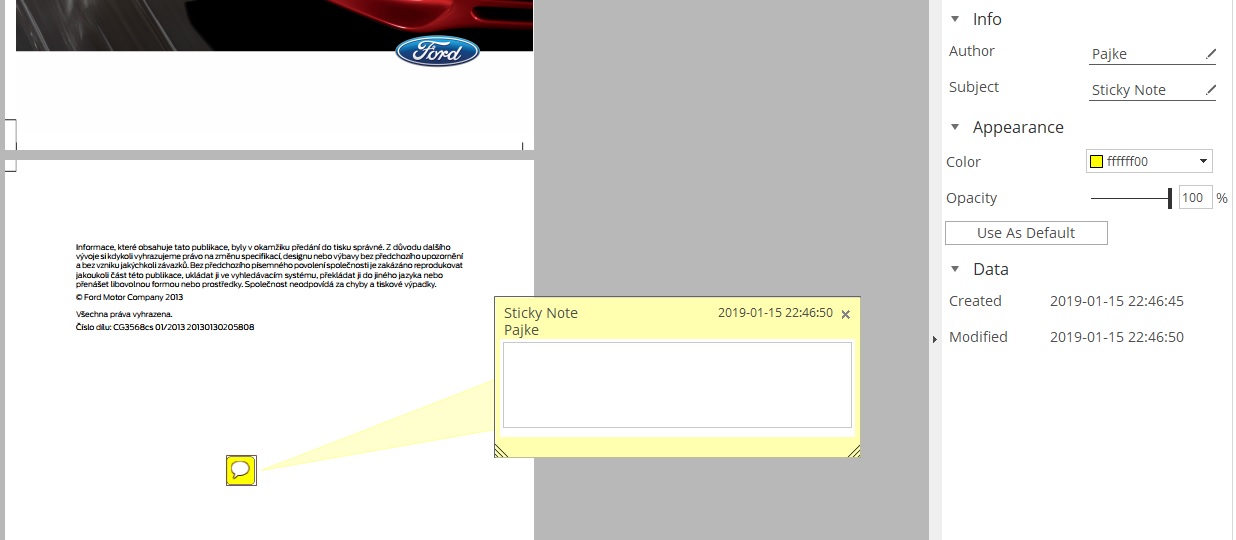 Chcete-li přidat do textu poznámku, tak klikněte v horní liště na možnost Nástroje, poté Anotace a vyberte Poznámka. Poté stačí kliknout do oranžového obdélníku a začít psát. Poznámku uzavřete tak, že jednoduše kliknete mimo ni.