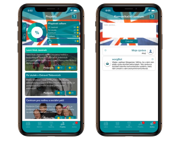A teď bonus navíc! Worganizer je jediná aplikace, pomocí které sbíráte kredity, za které si můžete koupit buď další lekci, nebo pomoci tam, kde je to třeba. Zopakujte si nová slovíčka a podpořte zá- roveň jeden z aktuálních charitativních projektů. Pomůžete tak nejen sobě, ale zároveň třeba lesníškolce nebo psímu útulku :)