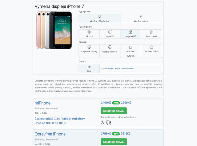Nabídky všech těchto servisů najdete na srovnávači iPhoneCare.cz, kde si můžete vybrat servis ve vašem okolí, servis s nejlepší cenou, nejlepším ověřeným uživatelským hodnocením nebo servis, kde prokazatelně montují originální díly.