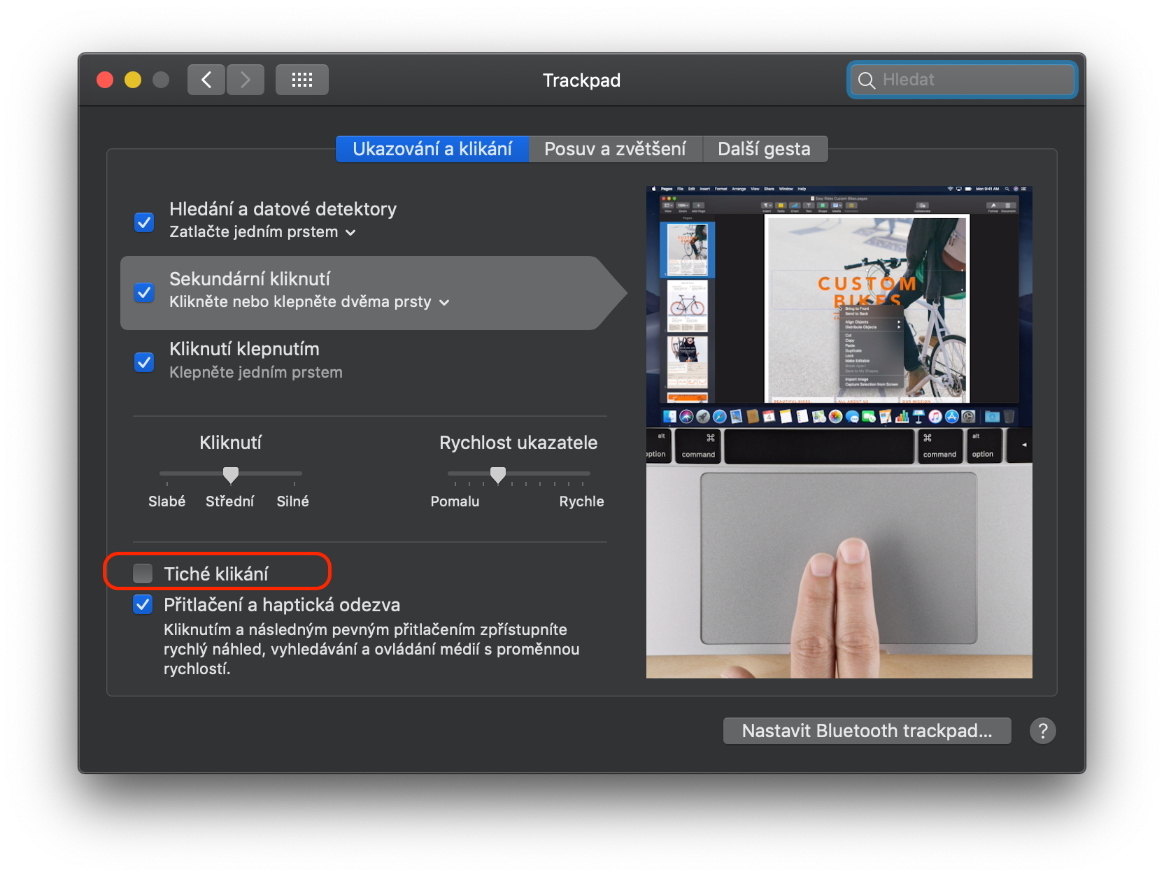Pokud vlastníte starší MacBook Pro bez Force Touch Trackpadu, tak stačí aktivovat funkci Tiché kliknutí. Pro aktivaci funkce přejdeme opět do Předvoleb systému a přesuneme se do záložky Trackpad (druhá řada, pátá ikona). Zde se v horním menu přesuneme do záložky Ukazování a kliknutí a ve spodní části okna aktivujeme funkci Tiché kliknutí. Nyní se náš Trackpad stane tišším.