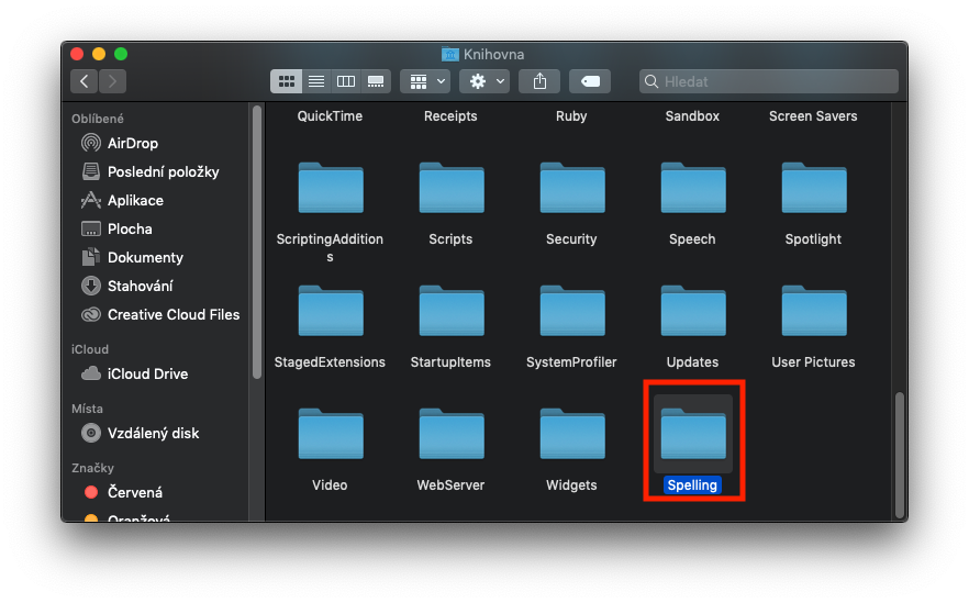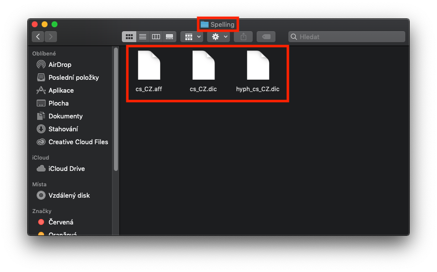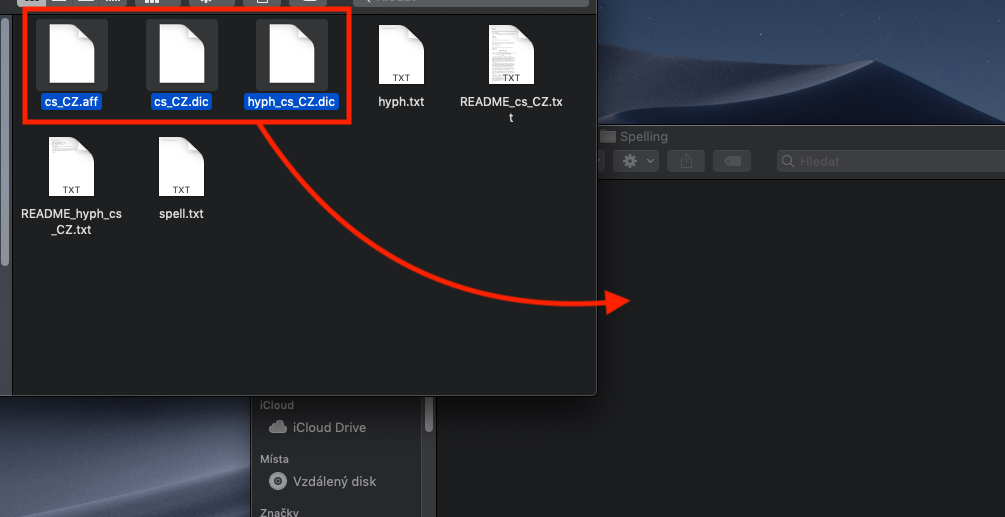 Jak už jsem zmínil výše, bohužel není k dispozici česká nativní kontrola pravopisu, a proto musíme využít té, kterou vytvořil někdo jiný. Nejdříve je tedy nutné, abychom si stáhli potřebné soubory – pro stažení těchto souborů klikněte na tento odkaz. Do počítače se nám stáhne .ZIP soubor cs_CZ, který nebudeme rozbalovat ani jej nijak nebudeme modifikovat. Poté se přepneme do aktivního okna Finderu a stiskneme klávesovou zkratku Command + Shift + G. Objeví se okno, do kterého napíšeme (bez uvozovek) „/Knihovna“ a stiskneme Enter. Poté je nutné v nově zobrazeném okně najít složku Spelling (pokud se zde složka nenachází, tak ji jednoduše vytvoříme). Do složky Spelling poté překopírujeme soubory cs_CZ.aff, cs_CZ.dic a hyph_cs_CZ.dic ze stáhnutého souboru cs_CZ.zip.