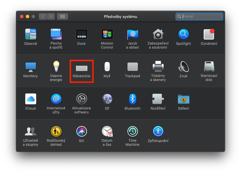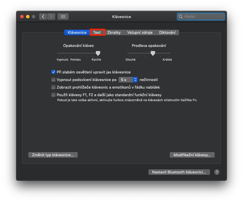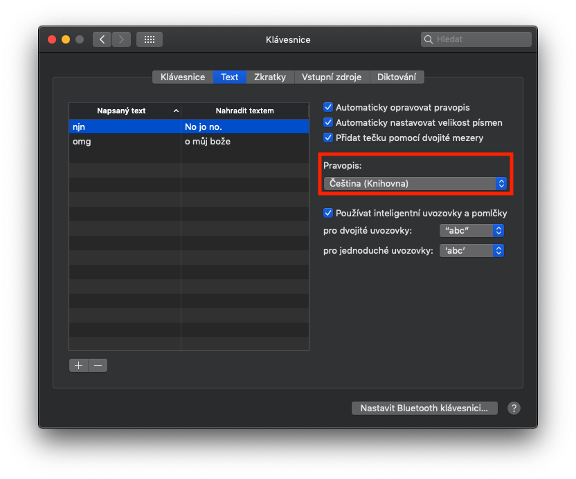 Poté otevřeme Předvolby systému pomocí Apple loga v levém horním rohu obrazovky a v nově zobrazeném okně rozklikneme sekci Klávesnice (druhý řádek, třetí ikona). V horním menu se přepneme do záložky Text a v rozbalovacím menu Pravopis vybereme možnost Čeština (Knihovna). Pokud se zde tato možnost nenachází, tak Mac restartujte.