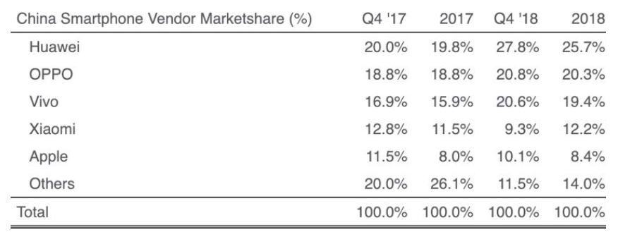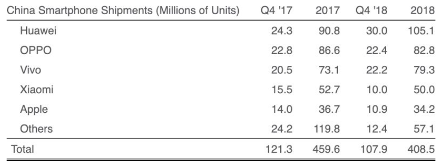 Podle odhadů Strategy Analytics Apple v roce 2018 dodal do Číny 34,2 milionů iPhonů, což je o 2,5 milionů méně než v roce 2017. Během posledního čtvrtletí 2018 bylo do Číny posláno 10,9 milionů iPhonů, což ve srovnání s 14 miliony z předešlého roku rovněž znamená pokles. Za čtvrté čtvrtletí loňského roku Apple předčil o 900 000 kusů společnost Xiaomi. Na trio Huawei, Oppo a Vivo ale skutečně nestačil. Celkově se Apple stal za rok 2018 se svými 34,2 miliony pátým největším prodejcem smartphonů v Číně. Před Applem se tedy umístil Xiaomi s 50 miliony, Vivo s 79,3 miliony, společnost Oppo dodala 82,8 milionů smartphonů a Huawei přibližně 105,1 milionů. Tabulky si můžete prohlédnout v galerii pod tímto odstavcem.