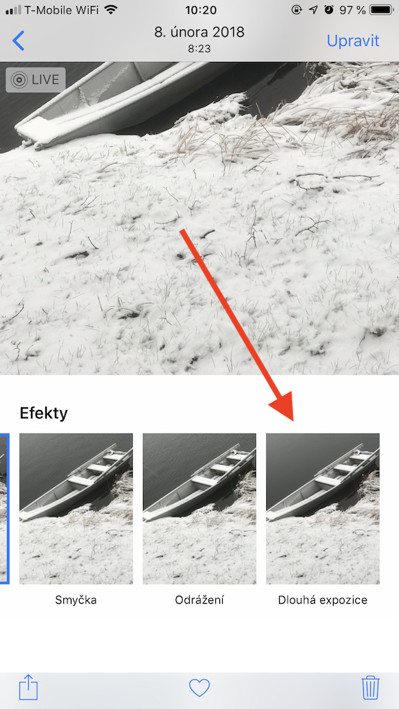 Padající sníh má své nesporné kouzlo, zachytit ho na iPhone ale může být někdy složité. Pomoci vám může některá z aplikací třetích stran, umožňující manuální nastavení rychlosti závěrky. Jednotlivé vločky lépe zachytíte nastavením vyšší rychlosti, dynamičtějšího výsledku dosáhnete nastavením pomalejší rychlosti. Pohrát si s tím, jak na snímku bude vypadat padající sníh, vám umožní i režim Live Photo. Při pořizování fotografie klepněte na režim Live Photo. Po jejím pořízení klepněte na samotný snímek, mírně ho posuňte směrem nahoru a z možností efektů vyberte variantu Dlouhá expozice.